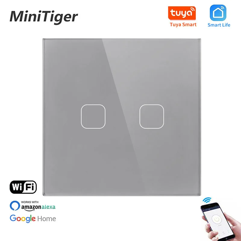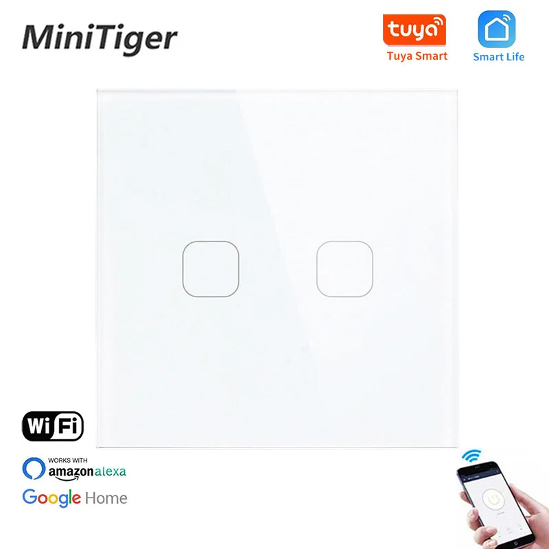 Сенсорный выключатель Minitiger из закаленного стекла, 2 комплекта, TuyaSmart Life, Wi-Fi, сенсорный выключатель, стандарт ЕС, беспроводное управление