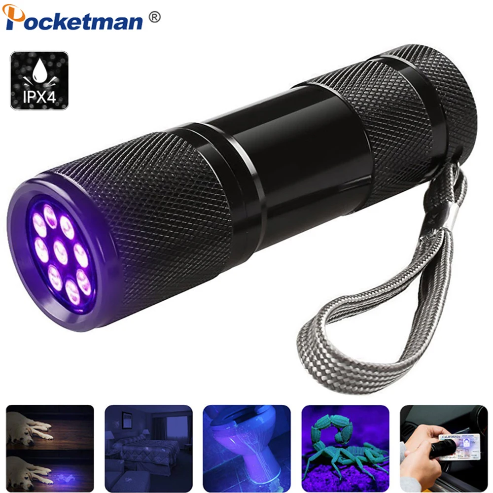 Мини 9 Светодиодный УФ-фонарик, Ультрафиолетовый светодиодный фонарик, Ультрафиолетовый Невидимый чернильный маркер, фонарь для обнаружения, 3AAA УФ-лампа