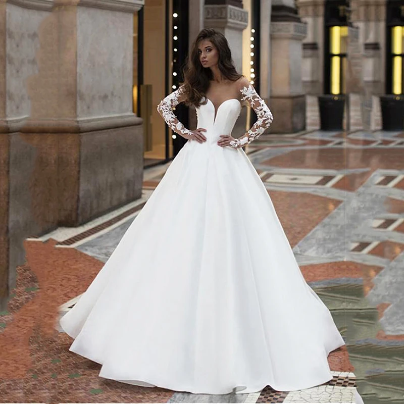 Платье свадебное с длинным шлейфом, атласное, с длинным рукавом