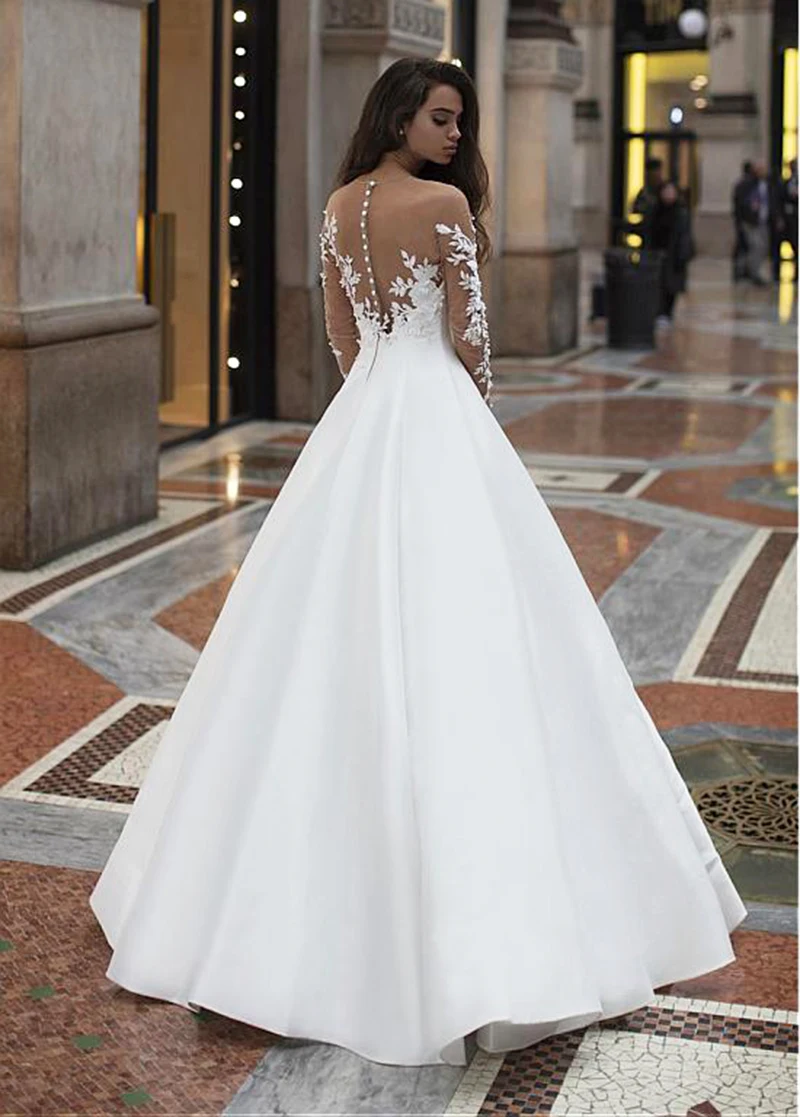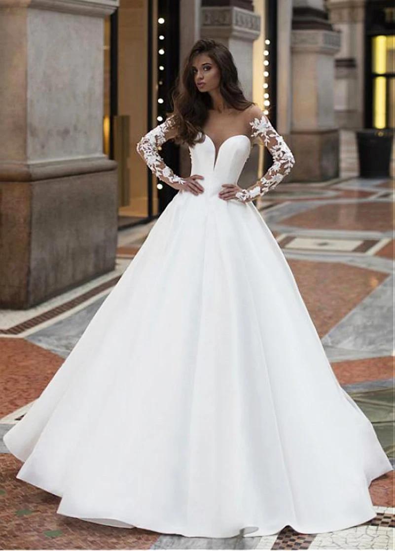 Платье свадебное атласное ТРАПЕЦИЕВИДНОЕ с длинным рукавом, апплика...