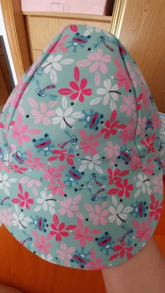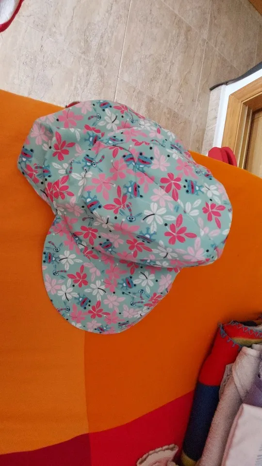 У меня цвет в реальности оказался не таким, как на мониторе, немного, но это не страшно. Я думала, она белая с рисунком, а фон оказался зелёным. Шапка налезла даже на меня)) и на двухлетке моей тоже села отлично. Удачный вариант запасной шапочки, когда детей в семье много)) козырёк можно отвернуть, нормально держится.