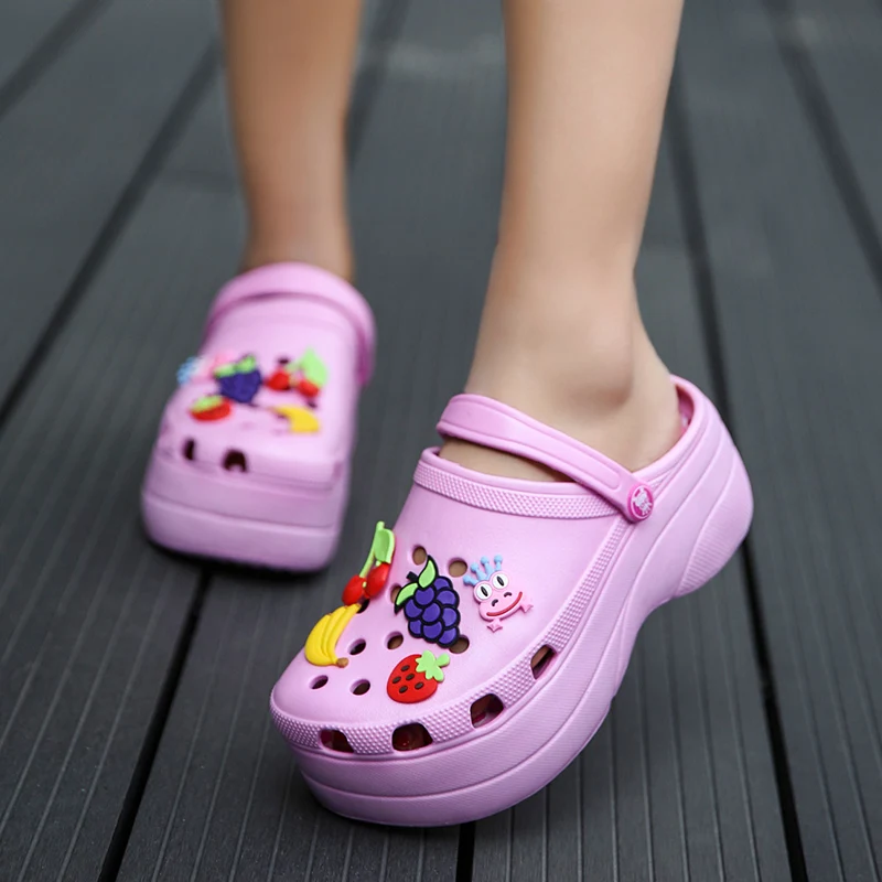 Сандалии женские для сада и пляжа, шлепанцы на платформе, мультяшный рисунок фруктов, без застежки, клоги, сланцы, летняя модель