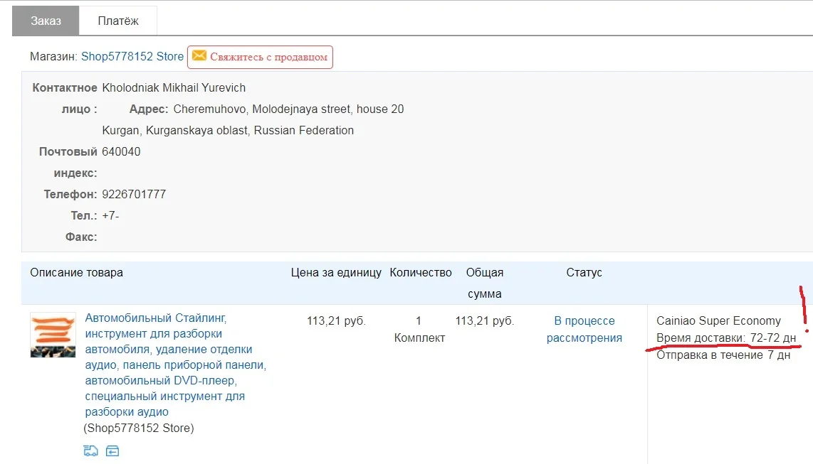 Страна: RU Доставка: Cainiao Super Economy 06.03.2021