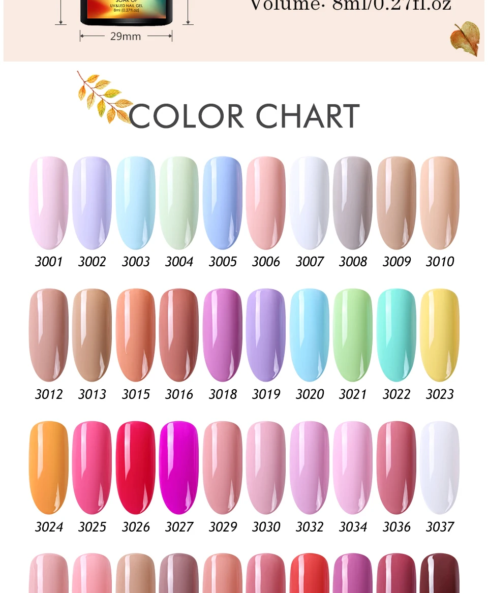 * Каждый вес нетто 8Мл, но емкость бутылки составляет более 8Мл, гель не будет полностью заполнен в бутылке!