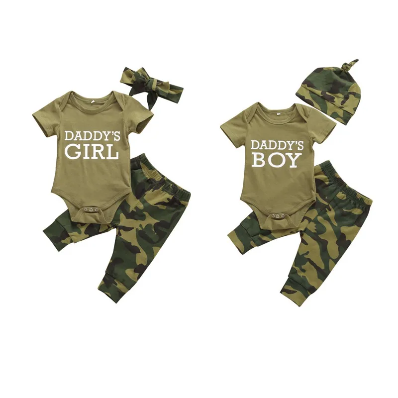 Брендовый комплект одежды для новорожденных девочек и мальчиков, Детский комбинезон с коротким рукавом и буквенным принтом + камуфляжные штаны, шапки или повязка на голову