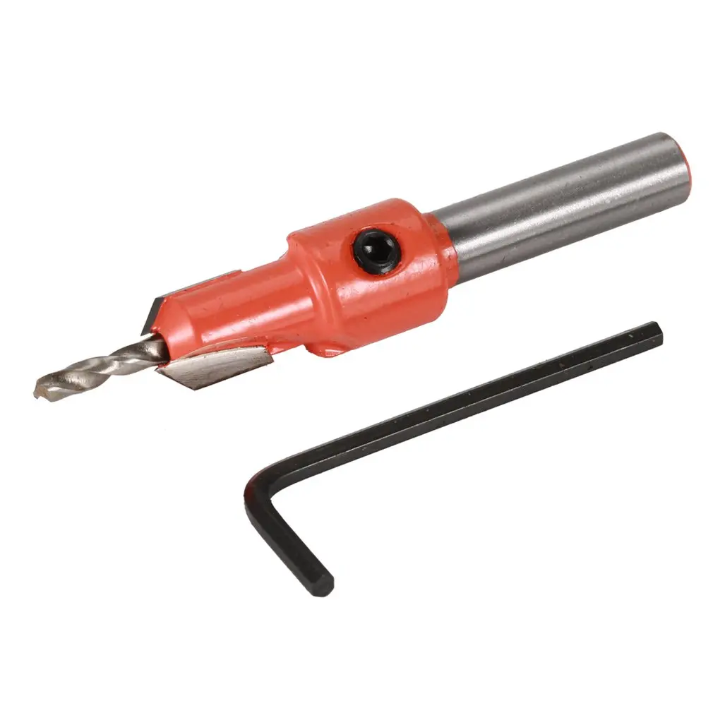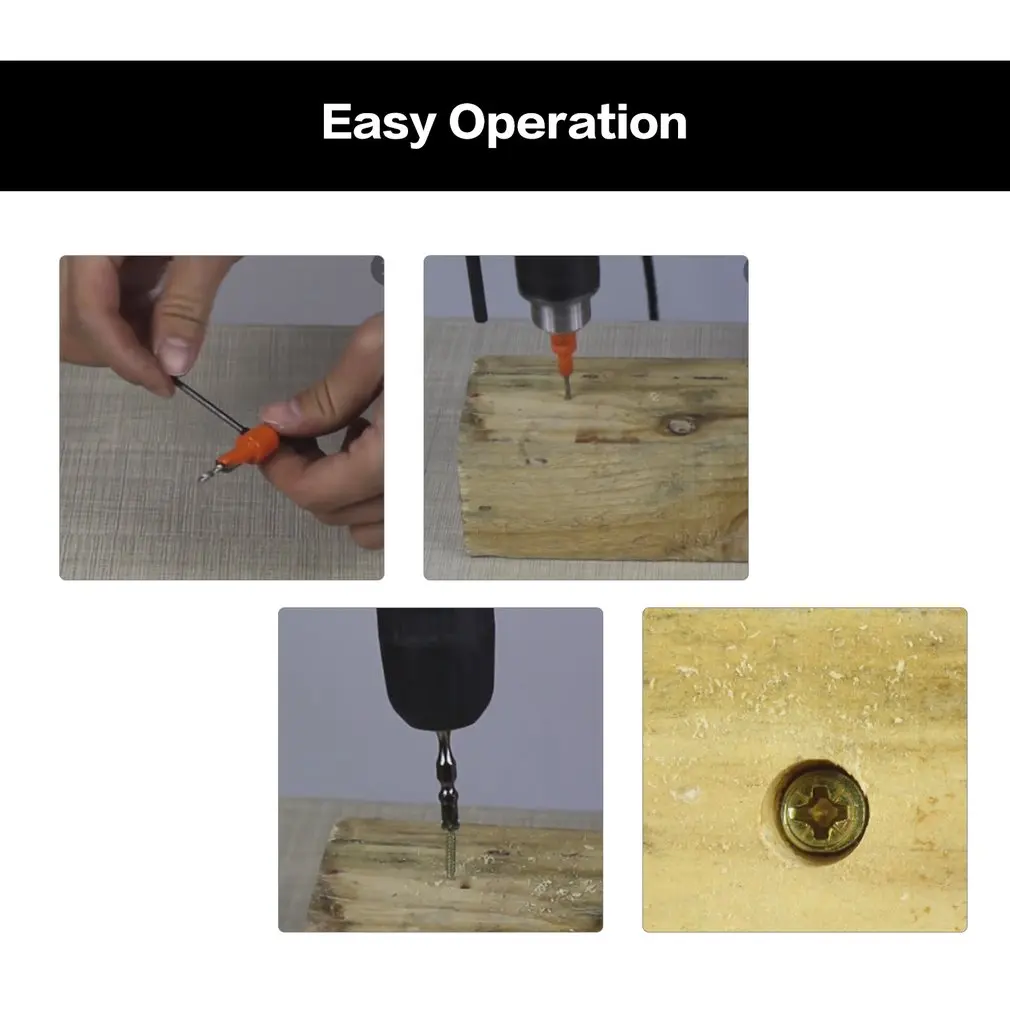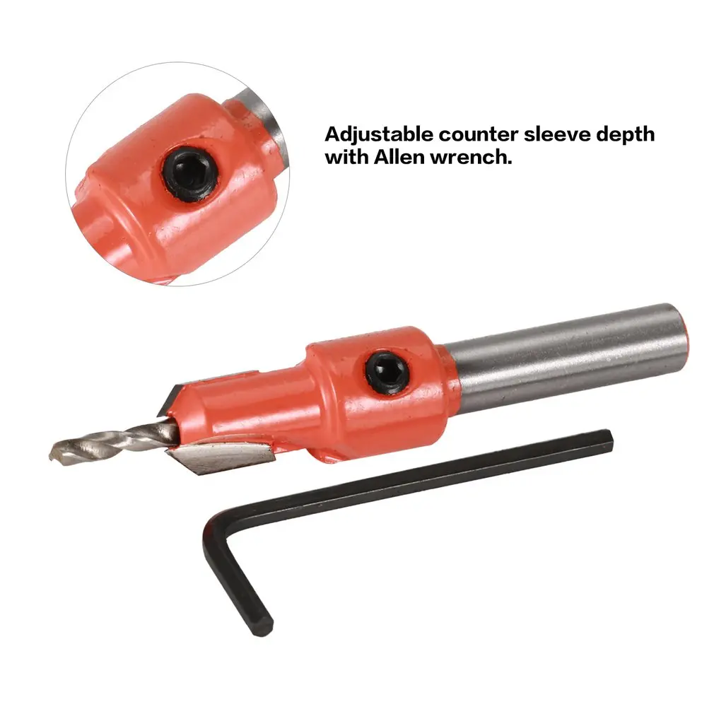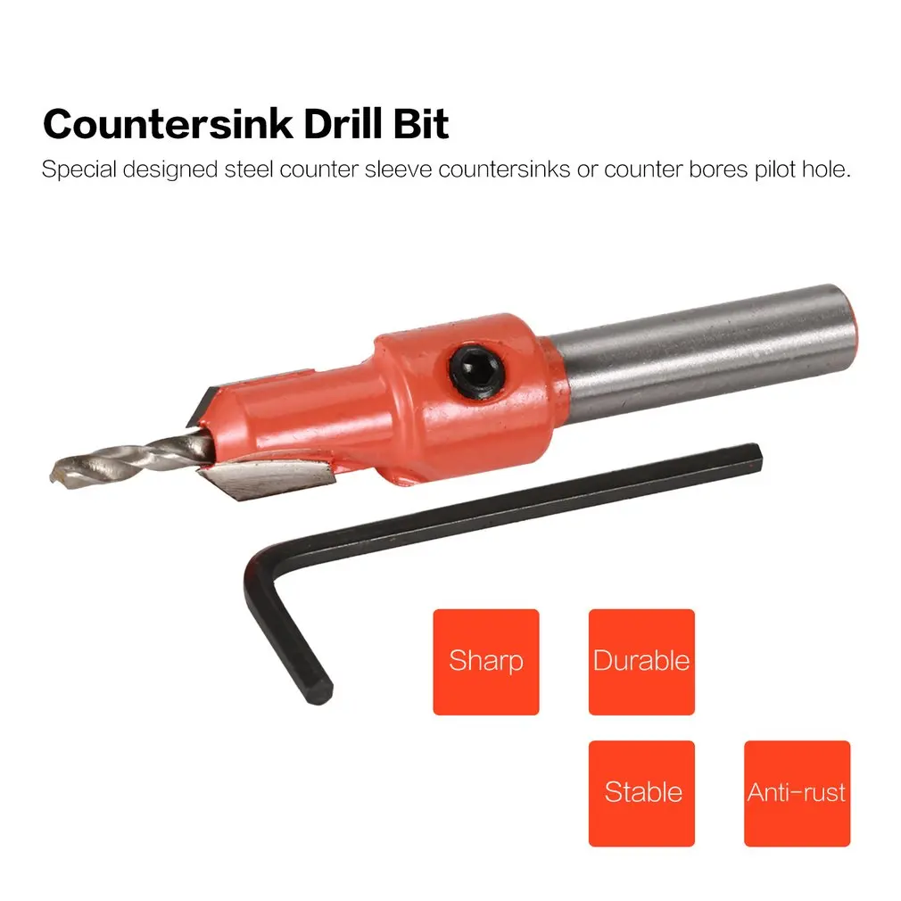Особенности:1. Специальный разработанный стальной счетчик втулки зенковки или счетчик боры пилотное отверстие.2. Регулируемая глубина рукава счетчика с шестигранным ключом3. Стандартный шестигранный хвостовик, быстро меняется и совместим.4. Сверло и Зенковка Для шурупов по дереву без смены бит.5. Длина сверления может быть отрегулирована для винтов различной длины просто ослабляя и затягивая установочный винт.