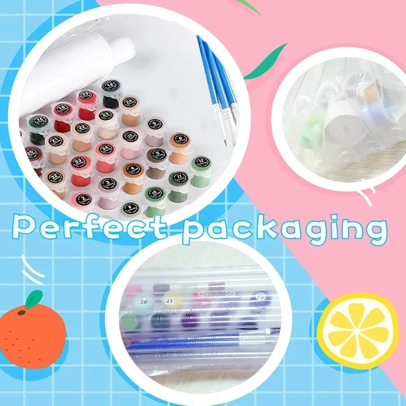Packing Include: 1*Canvas , 3*Brush, 1*Instruction, 1* Paints, 2*Non-trace hook, 2 Screw