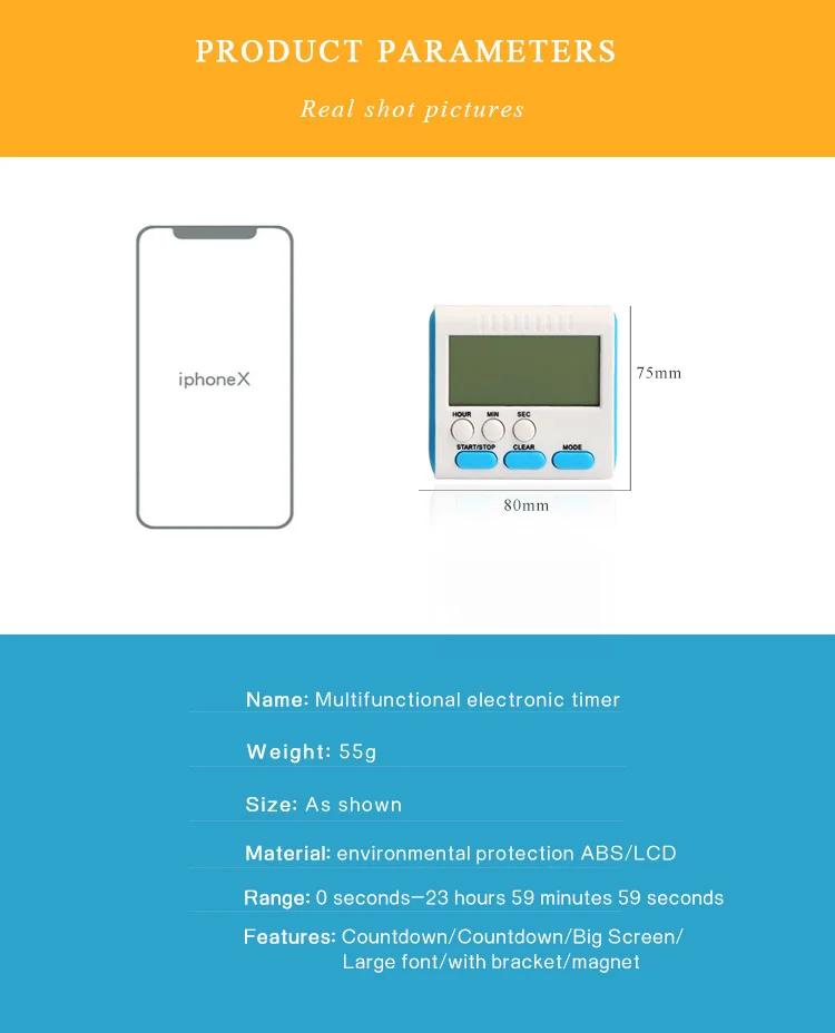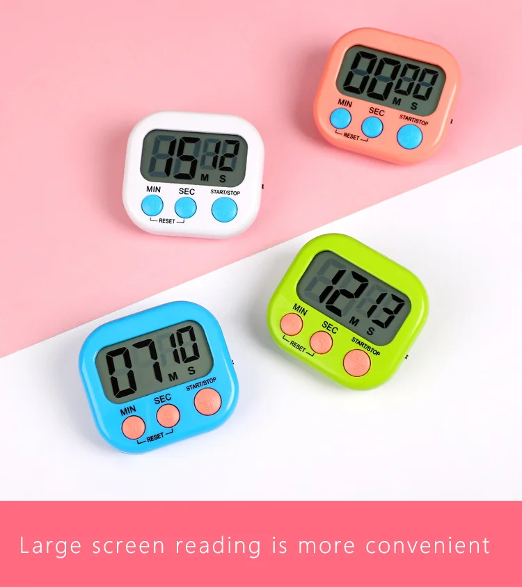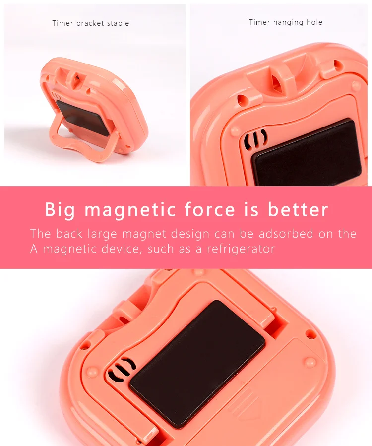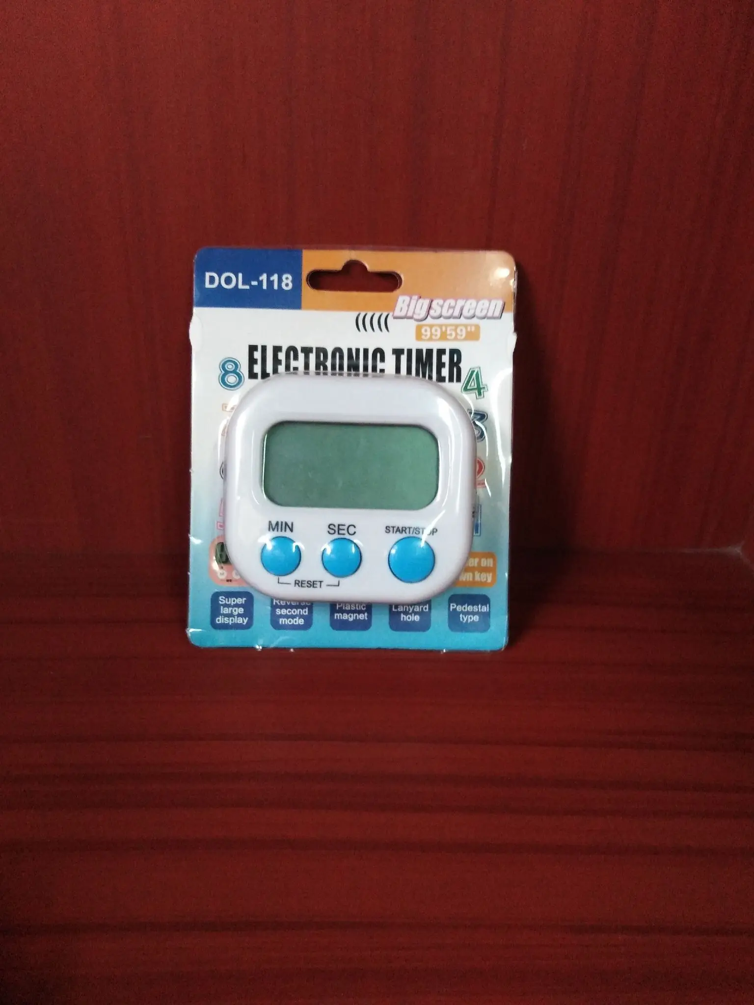 Я прибываю в очень хорошем состоянии, использую батарею AAA, есть возможность часов, таймер и секундомер. У него также есть магнит, который приклеивается к холодильнику или к какой-то аналогичной поверхности, и у него есть подставка.