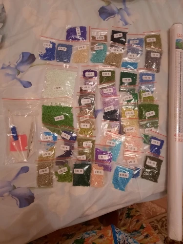 Доставка около месяца, но это уже наша почта "постаралась". Больше недели посылка проторчала на таможне. Каждый цвет упакован в отдельный зип-пакет соответствующего размера. Цвета яркие. надеюсь страз хватит, а то уже 2 картины ждут дополнительно заказанные стразы. Соберу, дополню отзыв.