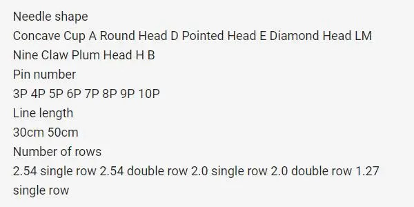 type1 A concave cup 5P x 50 cm x2.0x1 type2 A concave cup 35P x 50 cm x2.0x2 type3 A concave cup 5P x 50 cm x 1.27x1 type4 A concave cup 6P x 30 cm x 2.54x1 type5 A concave cup6P x 30 cm x 2.54x2 type6 A concave cup 6P x 30 cm x 2.0x1 type7 A concave cup 6P x 30 cm x 2.0x2 type8 A concave cup 6P x 30 cm x1.27x1 type9 round head D 5Px50cmx2.54x1 type10 pointed E 5Px50cmx2.54x1 type11 diamond head LM 5Px50cmx2.54x1 type12 Nine-claw plum blossom head H LM 5Px50cmx2.54x1 type13 needle B 5Px50cmx2.54x1