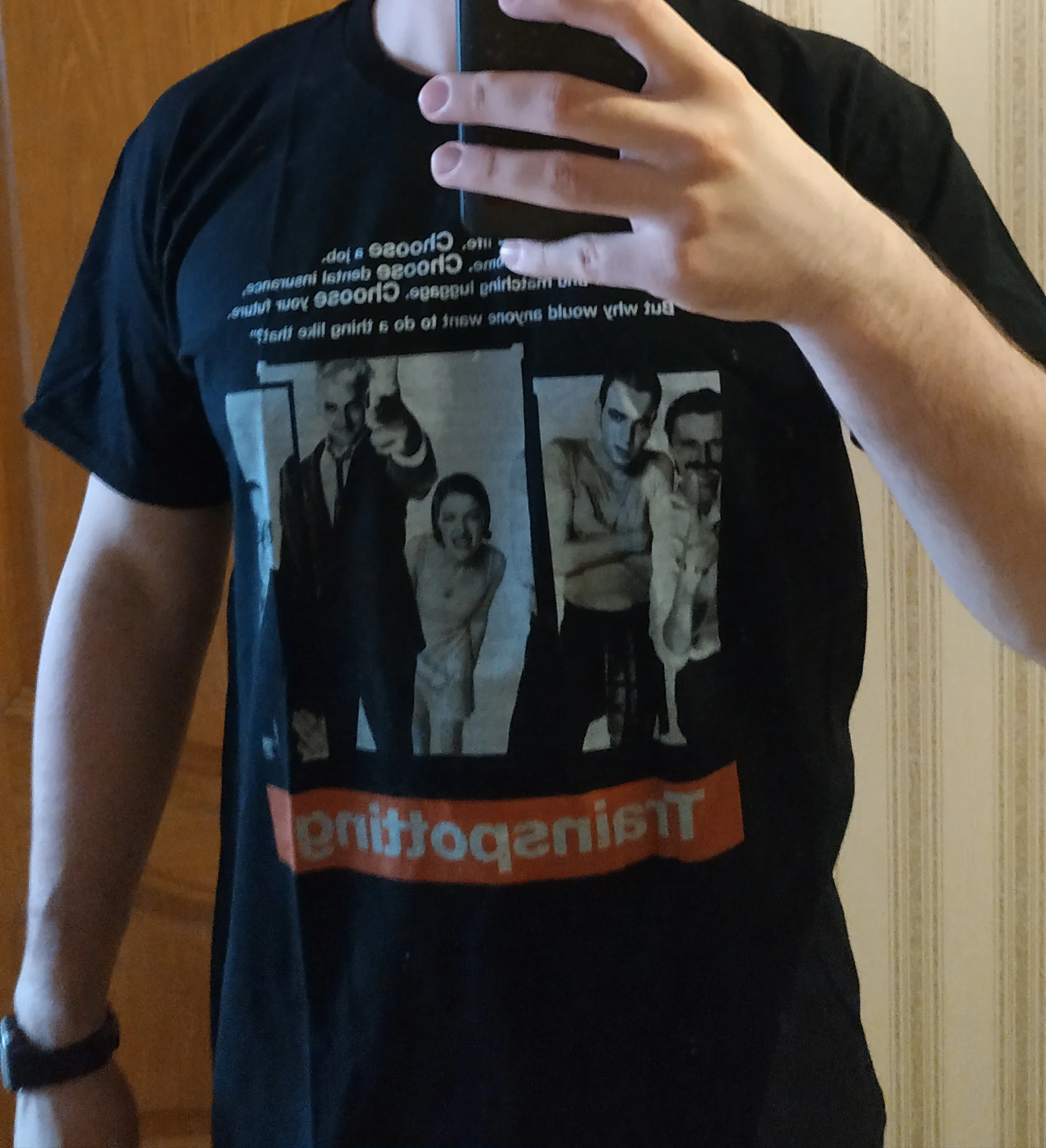 Доставка до Москвы за 12 дней! 100% хлопок, не соврали, на ощупь приятный и не вызывает раздражения. Принт хороший, я не могу сказать, что он продержится много лет (получил только сегодня), но сделан нормально, не тупая наклейка сверху, а интегрирован в хлопок. В общем фанатам жанра рекомендую, я очень довольно и улыбаюсь (как Рентон). ВЫБЕРИ ФУТБОЛКУ!!!
