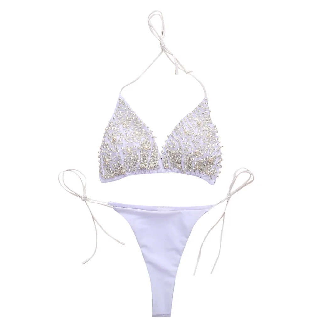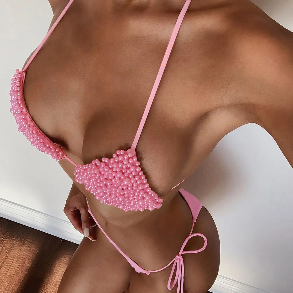 Женский купальник бикини на бретельках, украшенный жемчугом, бандо, стринги, бандажный комплект бикини, бразильский купальник с пуш-апом, пляжная одежда, купальник, 2021
