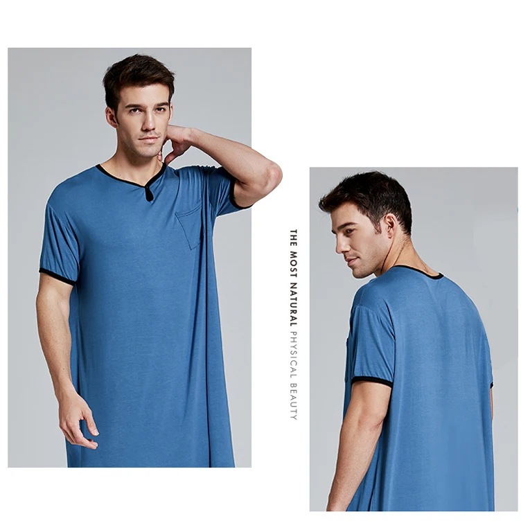Пижама Мужская с короткими рукавами, хлопковая ночная рубашка с круглым вырезом и карманами, винтажный кафтан, домашняя одежда, M-3XL