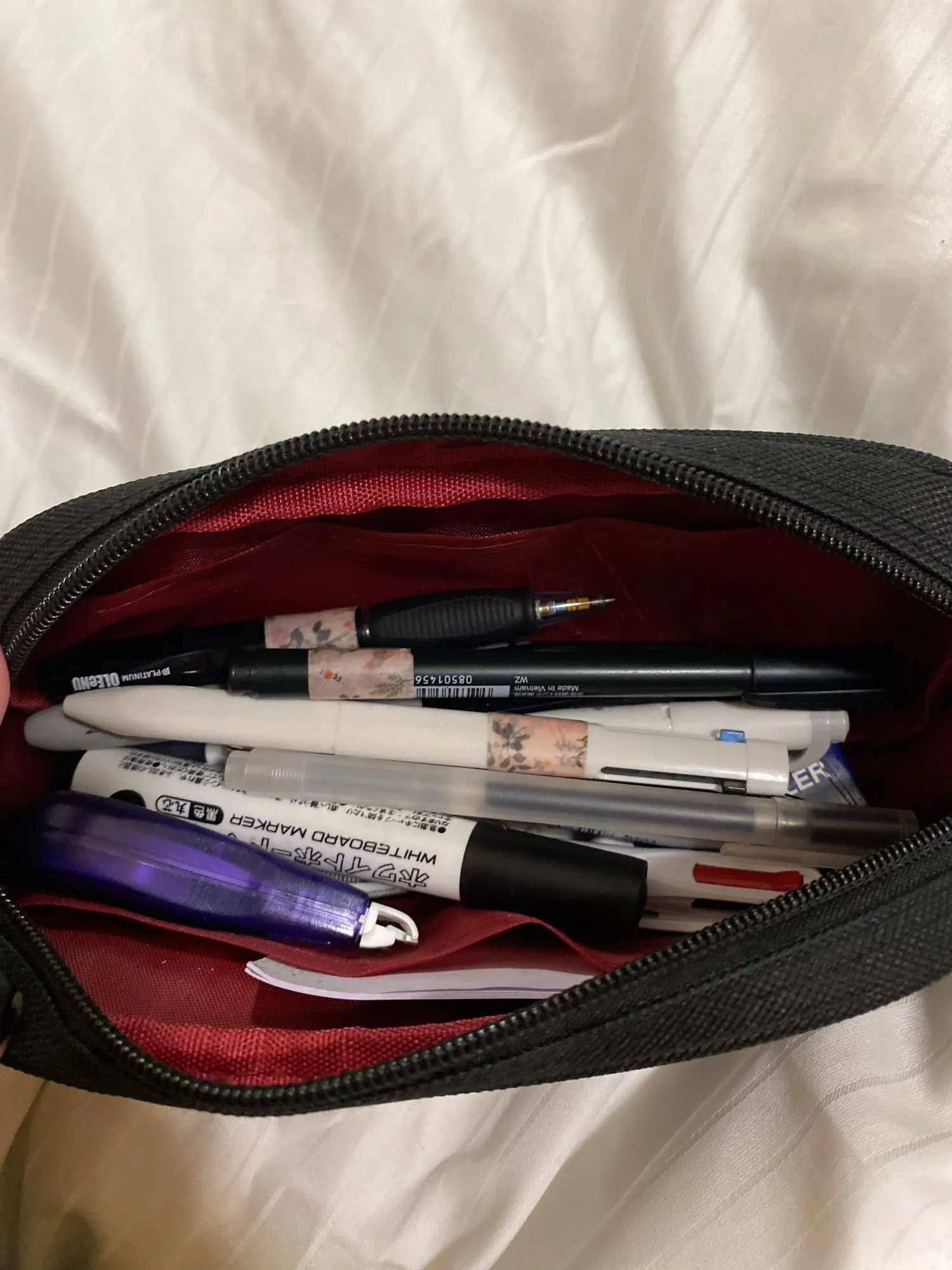 Очень мило и удивительно просторно! Я в состоянии приспосабливать 16 ручек + Выбеленные, ластики, линейки и липкие блокноты с тоннами места в запасе. Материал на ощупь прочный, и молния гладкая (немного громкая, если это вас не устраивает). Некоторые нитки высовываются в несколько мест, но это ничего, что пара ножниц не может исправить :)
