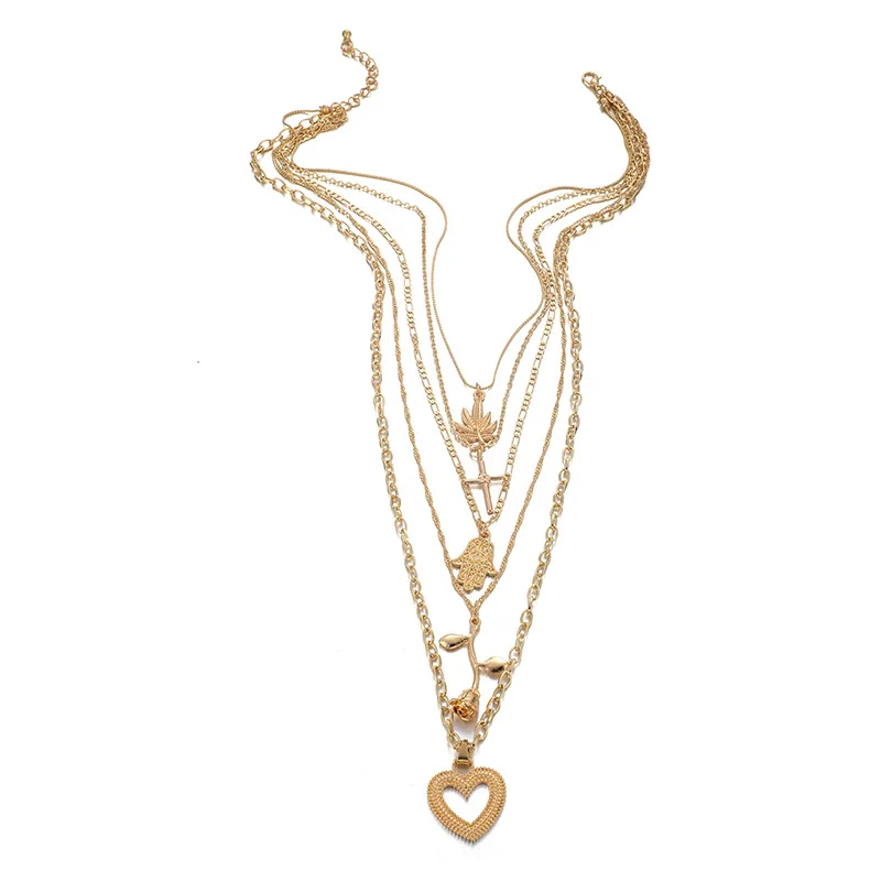 Ожерелье женское многослойное под розовое золото с крестом на ладони