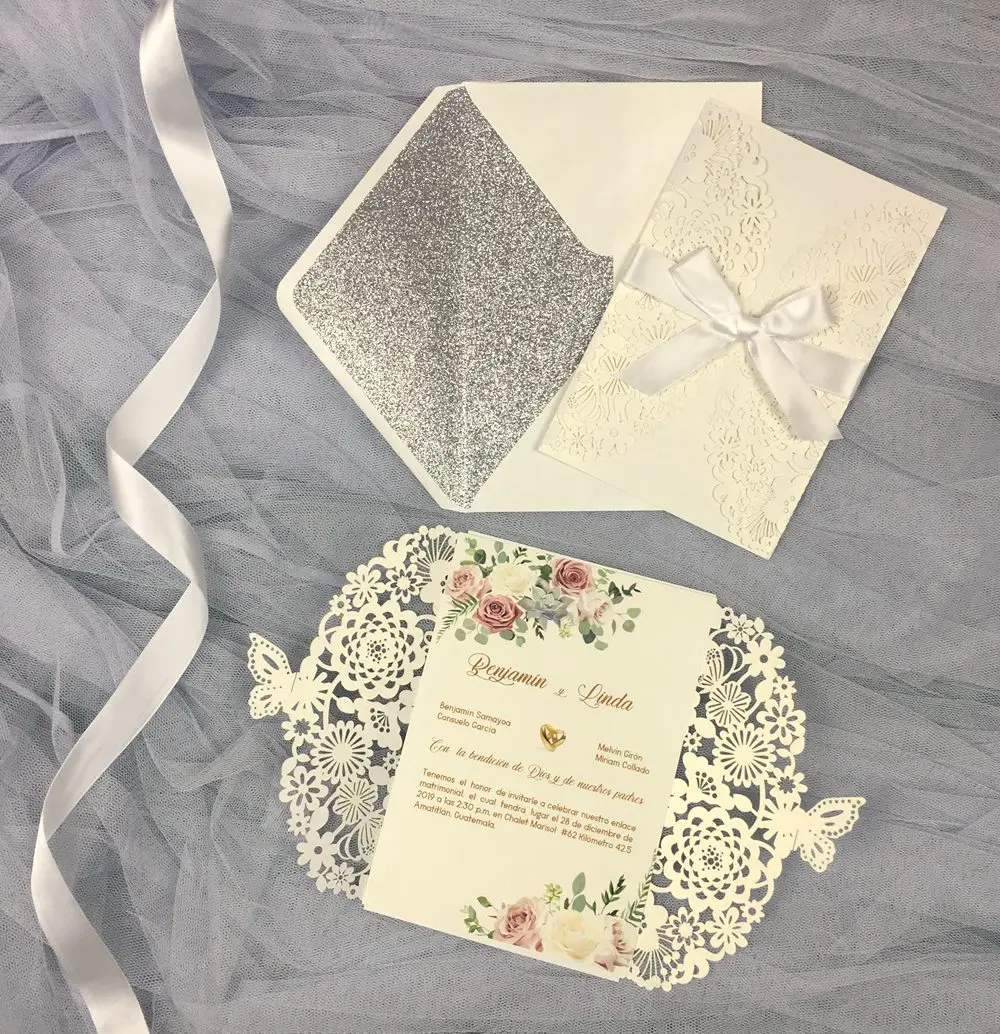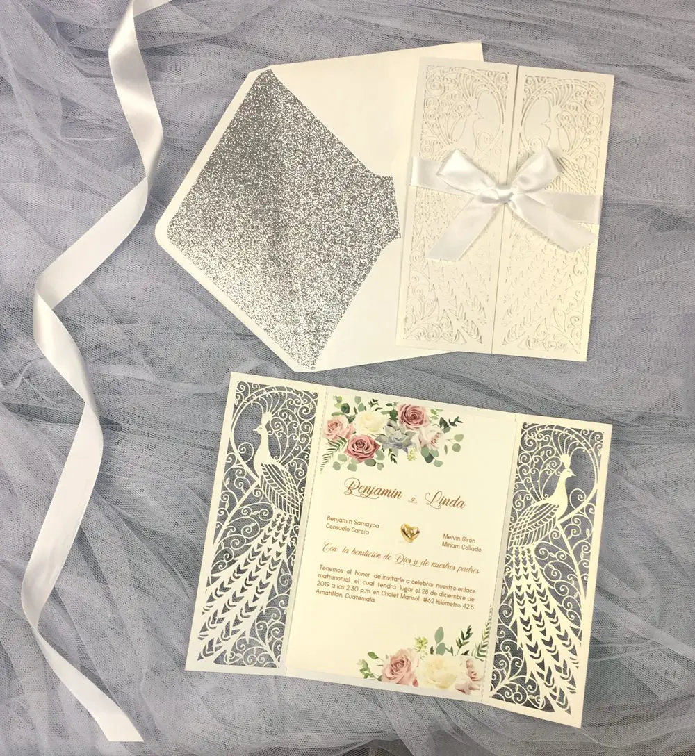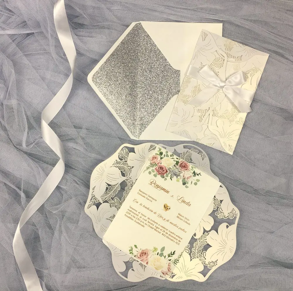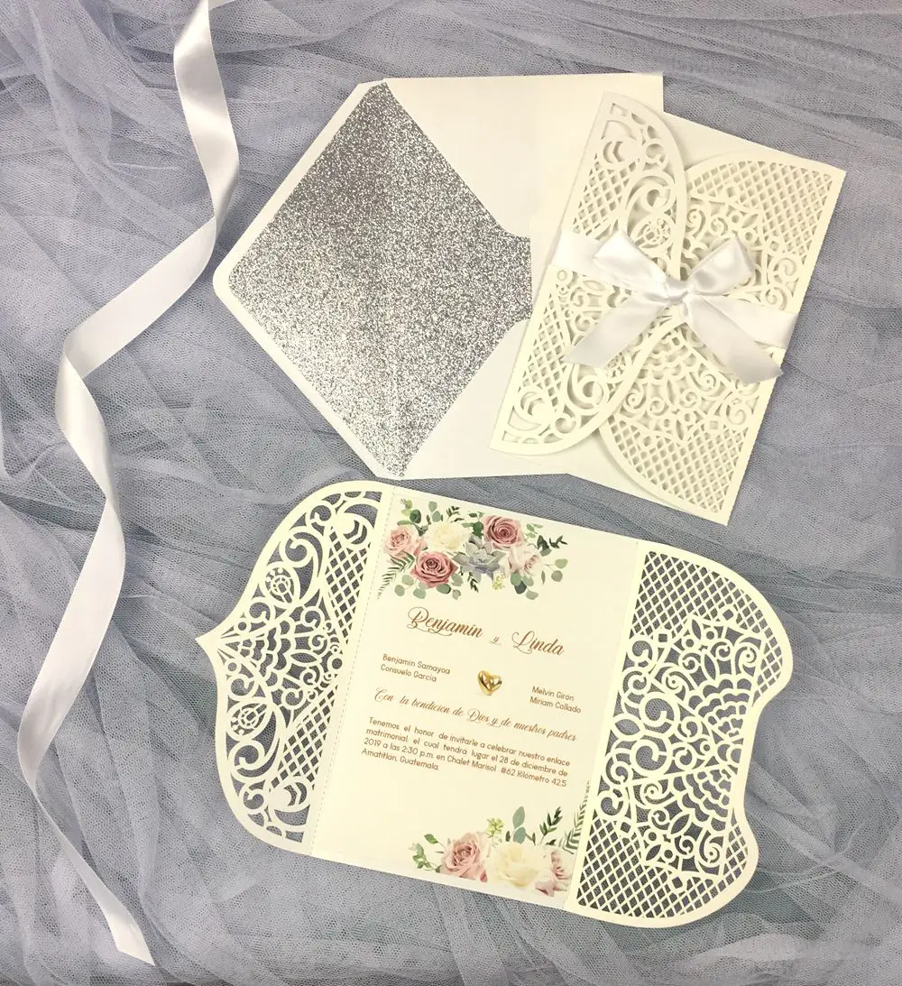 Белые Пригласительные открытки, 1 шт., лазерная огранка золота дерево, Свадебный кармашек, пригласительные, на день рождения, свадьбу, Серебряный Блестящий конверт