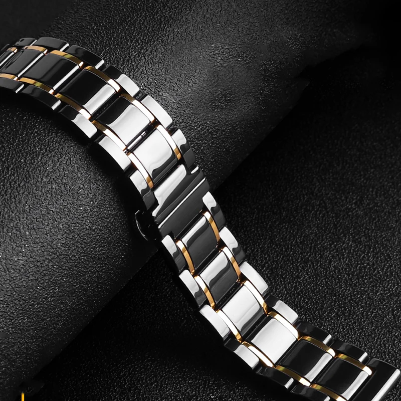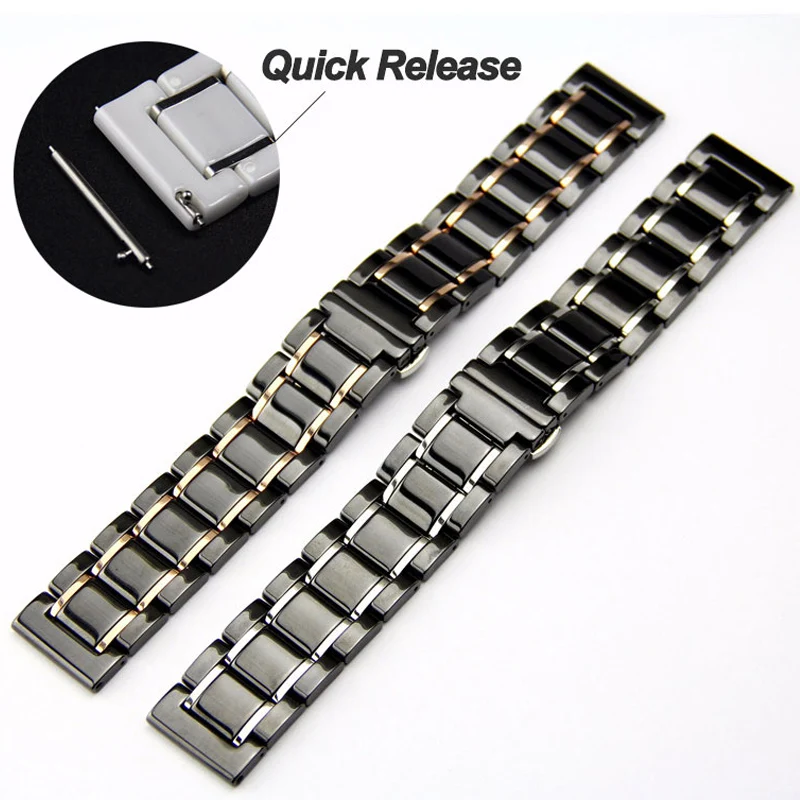 Ремешок выполнен из сочетания керамики и нержавеющей стали. -Быстросъемный дизайн: высококачественный керамический браслет для часов с быстросъемным дизайном, элегантный, модный и удобный в носке. С быстросъемными пружинными стержнями просто установите и отсоедините ремешок вручную, никаких инструментов не требуется; 3 Быстросъемных штифта в комплекте (2 для прямого использования и 1 для запасных). -Регулируемая длина: все керамические звенья съемные, очень легко снять звенья, чтобы изменить размер длины ремешка, чтобы идеально подогнать ваше запястье. Инструмент для удаления звеньев входит в комплект. Подходят на все запястья размером меньше 8,6 дюйма (220 мм). Длина ремешка: 6,7 дюйма (170 мм). Длину ремешка можно увеличить, чтобы удовлетворить потребителя (большое запястье руки), толщина: 3,8 мм, Вес: около 2,8 унций.(80 г). -Серебристая застежка-бабочка из нержавеющей стали: Застежка-бабочка из высококачественной нержавеющей стали с двойной кнопкой позволяет быстро освободить и снять ремешок. Раскладывающаяся застежка/Пряжка witДве Нажимные кнопки обеспечивают безопасность Ваших часов и с помощью «щелчка» быстро снимаются и закрываются