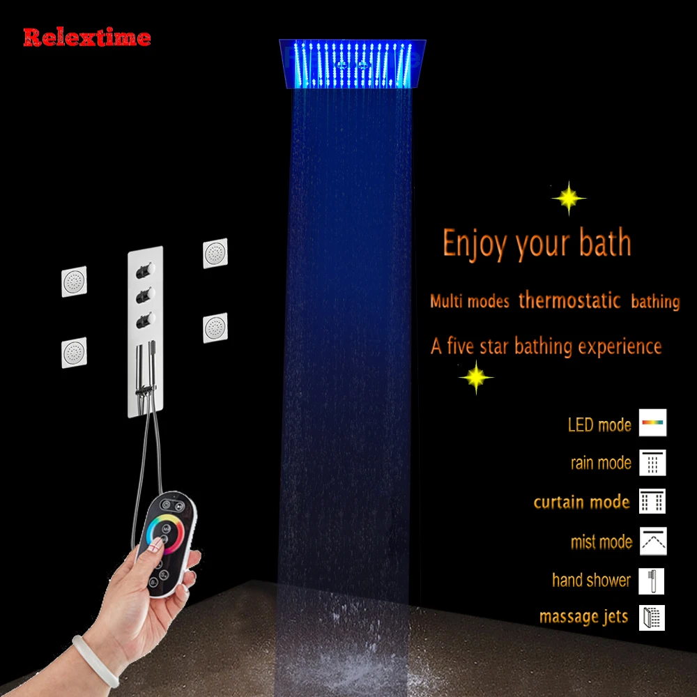 Новый стиль, светодиодный набор для душа для ванной комнаты, 5 выходов, термостатический смеситель с насадкой, светящийся светодиодный потолочный Душ, дождевая насадка, занавеска, спрей, туман с массажными струями EF4302