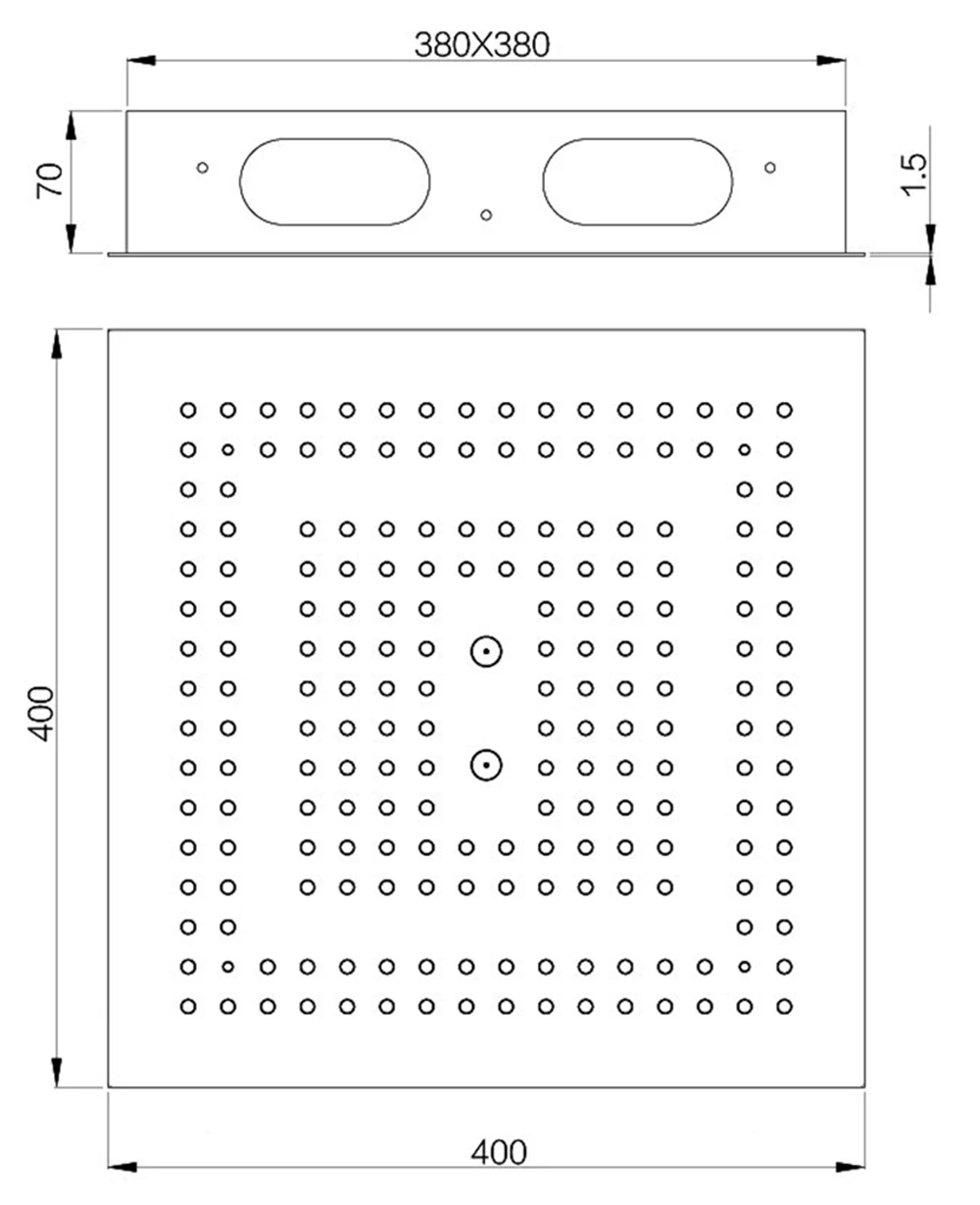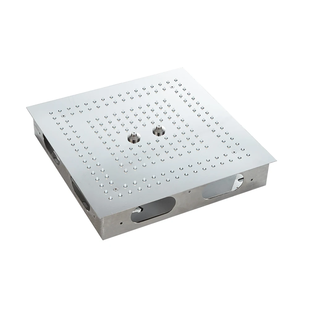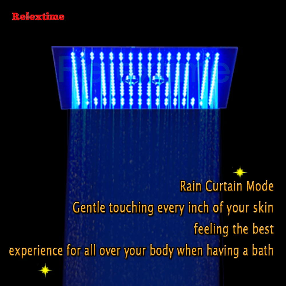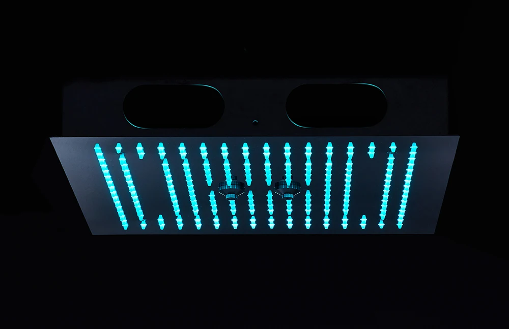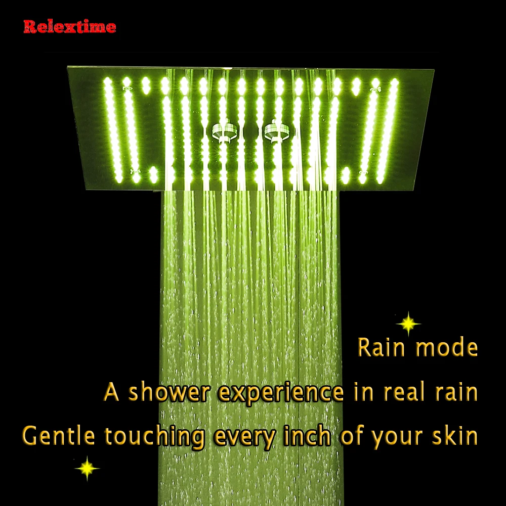 Он изготовлен из SUS304 и закончен зеркалом, размер 400x400 мм, есть 3 Функции включает в себя: осадки, занавески, распылительный туман, роскошный светодиодный свет, светодиодный светильник подключен к источнику питания для производства стабильного электричества, поэтому светодиодный светильник имеет длительный срок службы, сопло светится, вода вытекает из светящегося сопла, Это очень красиво и очень романтично, Протестировано с 3 бар давления воды, Скорость потока: дождь: 15л/м; Занавес: 15л/м; Спрей туман: 9л/м; он был встроен в потолок, когда мы устанавливали его, размер отверстия потолка 385*385 мм. ПНапряжение питания для душевой головки составляет 90 ~ 260 В переменного тока.
