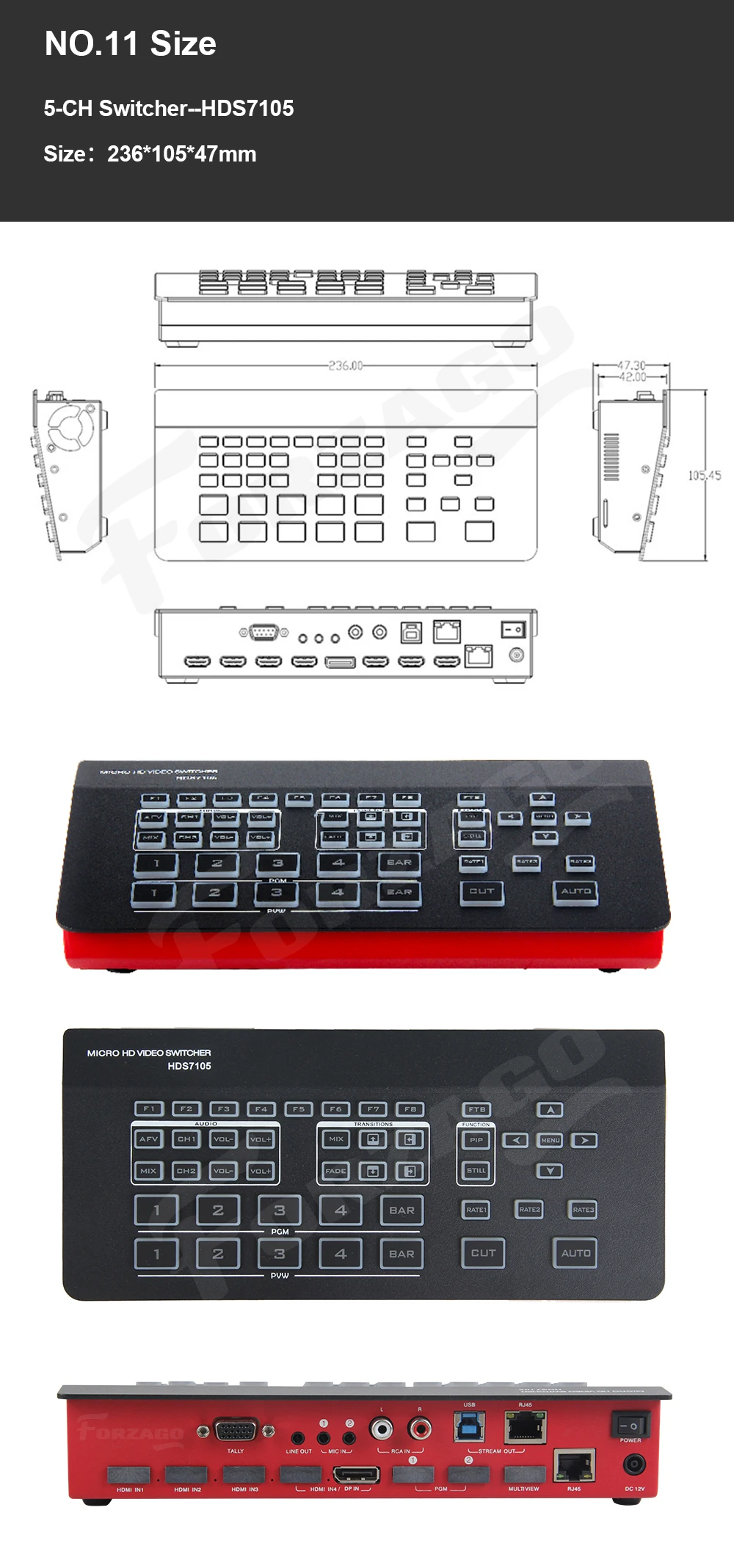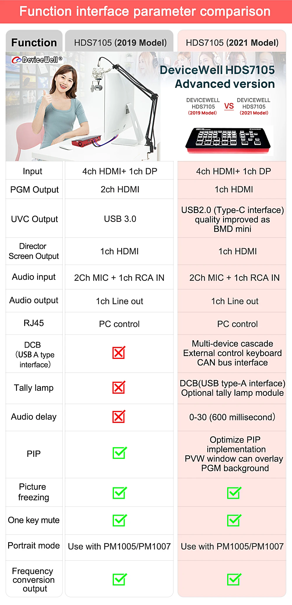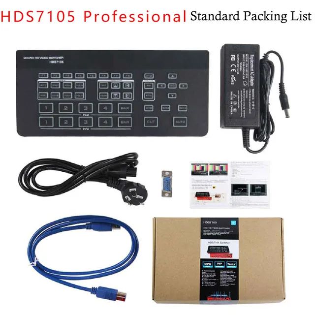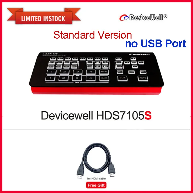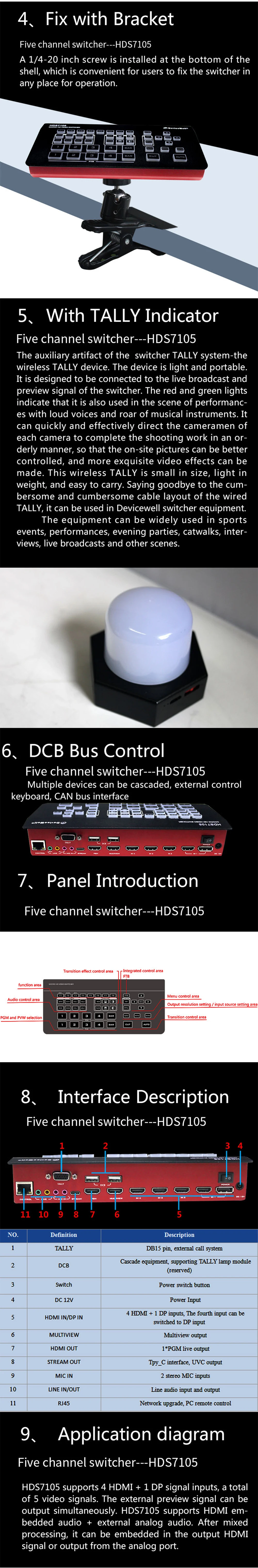 HDS7105 версия:◆ Портативный интегрированный дизайн◆ Металлический фюзеляж, высокая прочность и вес светильник◆ Встроенная клавиатура управленияПоддержка до 4 входов HDMI + 1 DP◆ Два стерео микрофона◆ 1 комплект аудиовхода lotus seat◆ 1 линейный выход◆ Поддержка следующих аудио и функций смешивания◆ Поддержка HDMI audio de-embedding◆ Выход PGM: 2 HDMI◆ Выход с несколькими изображениями: 1 HDMI◆ Поддержка микс/выцветание и другие спецэффекты переключения◆ Поддержка резки и автоматического переключения спецэффектов◆ Поддержка Tally HDS7105S (базовая версия):◆ Портативный интегрированный дизайн◆ Металлический фюзеляж, высокая прочность и вес светильник◆ Встроенная клавиатура управления◆ Поддержка 4 * HDMI + 1 * DP вход◆ Поддерживает выход 2 * HDMI, включая один выход прямого эфира (PGM) и один выход мультипросмотра◆ Поддерживает 2 стерео микрофона◆ 1 Набор линейный вход/выход поддерживается◆ Поддержка однокнопочного переключения выходного разрешения◆ Поддержка функции отключения звука одной кнопкой◆ Поддержка следующих аудио и функций смешивания◆ Поддержка HDMI audio de-embedding◆ Поддержка микс/выцветание и другие спецэффекты переключения◆ Поддержка резки и автоматического переключения спецэффектов◆ Поддержка сетевого управления и обновления◆ Поддержка входного напряжения DC12V Сравнение 7105 и 7105S (базовая версия):1. 7105S не имеют высокий интерфейс2. 7105S не имеют входную и выходную группу аудиопорта Lotus Head3. 7105S уменьшает один HDMI PGM выходной интерфейс4. 7105S уменьшает интерфейс USB и интерфейс push-flow (Примечание: порт push-flow на HDS7105 является резервным интерфейсом и не имеет функции)5.HDS7105S добавляет функцию отключения звука одной кнопкой