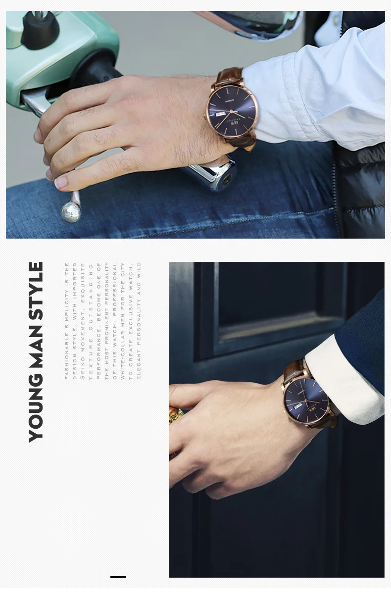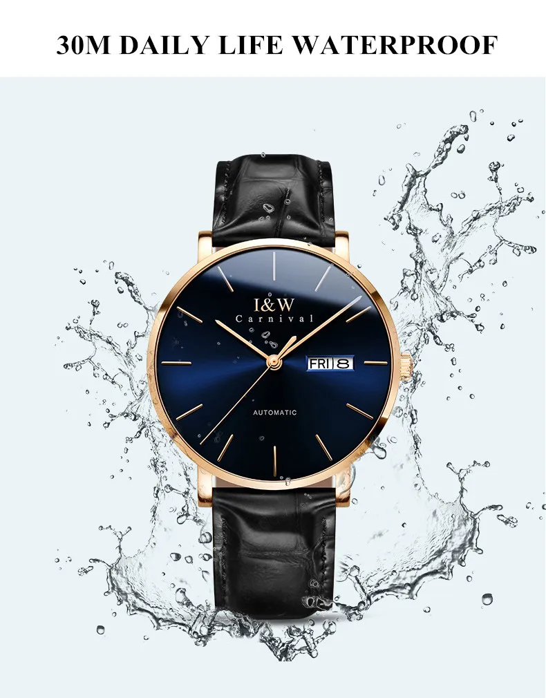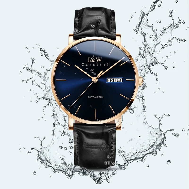 Часы наручные Carnival Brand Мужские механические, брендовые роскошные золотистые автоматические модные водонепроницаемые с тонким календарем в деловом стиле