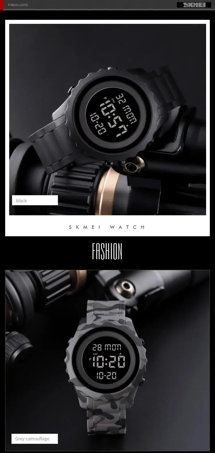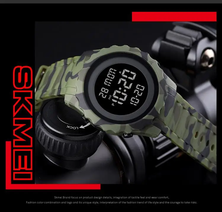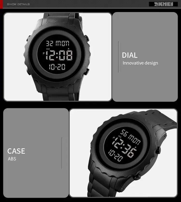 Бренд: SKMEIСтиль: Модный, спортивный, повседневныйМеханизм: ЦифровойЧехол: полиэстерДиаметр циферблата: 42 ммЧехол Толщина: 12 ммРемешок для часов: искусственная кожаДлина ремешка: 24 смШирина ремешка: 20 ммЗастежка: ПряжкаМатериал циферблата: стеклоВодонепроницаемость: 50 метровВес нетто часов: 57 г