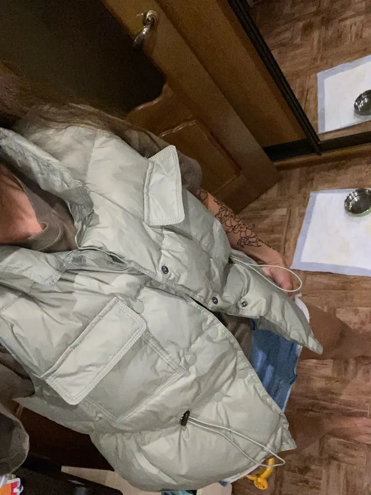 Пришла за месяц. Жилетка прикольная. Но не сильно дутая. На 46 рус. Взяла L. Не в притык но и не оверсайз. Талия на месте. У кого большая грудь, надо брать побольше