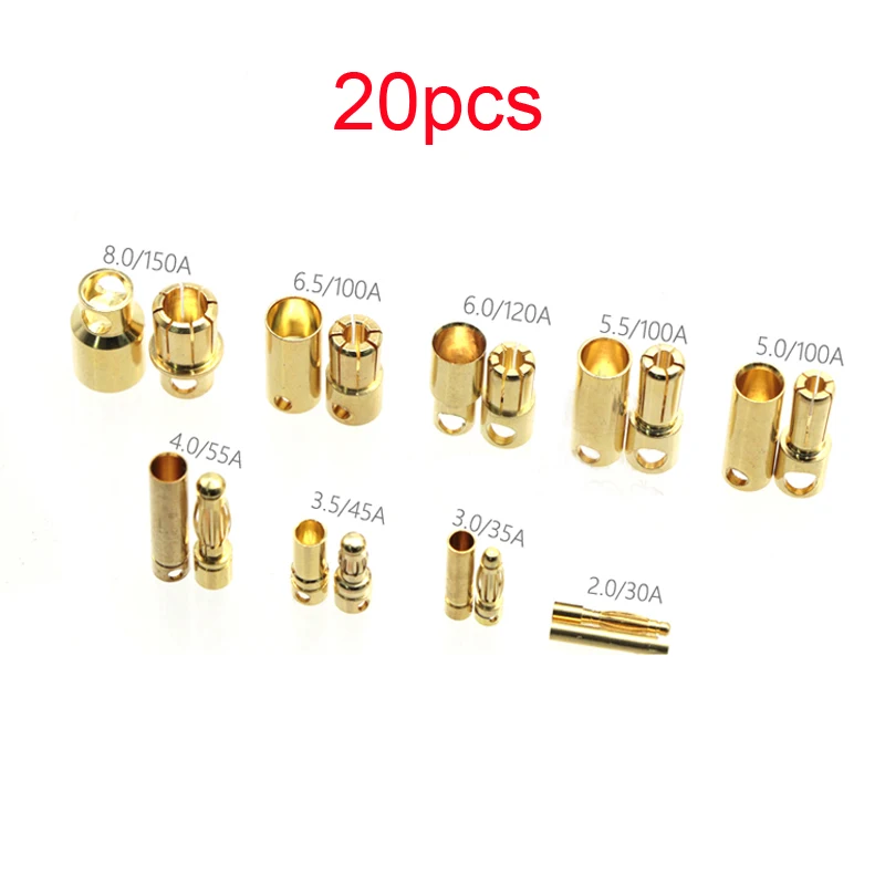 20 шт. 2,0 мм3,0 мм3,5 мм4,0 мм5 мм5,5 мм6 мм6,5 мм8 мм вилка типа банан мотор ESC позолоченный Штекерный разъем для радиоуправляемой модели