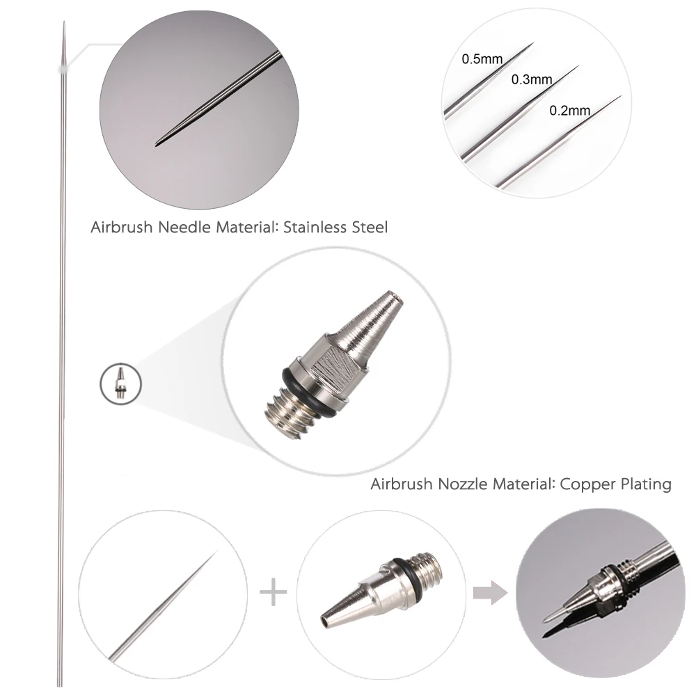 Включает в себя 0,2 (внутри Аэрограф), 0,3, 0,5 мм иглы и насадки с широким распыла от волосяного покрова до 2 "в ширину.
