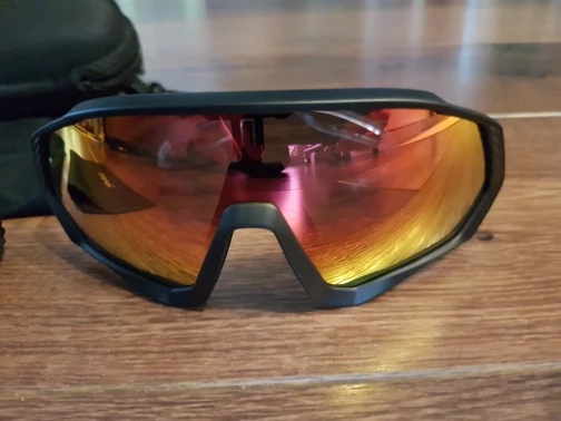 Отличные очки, линзы и оправа отличного качества. Идеальный размер, защищающий глаза от света и частиц. Одна деталь-это зеркальные линзы, которые поставляются с очень сложными облегающими линзами.