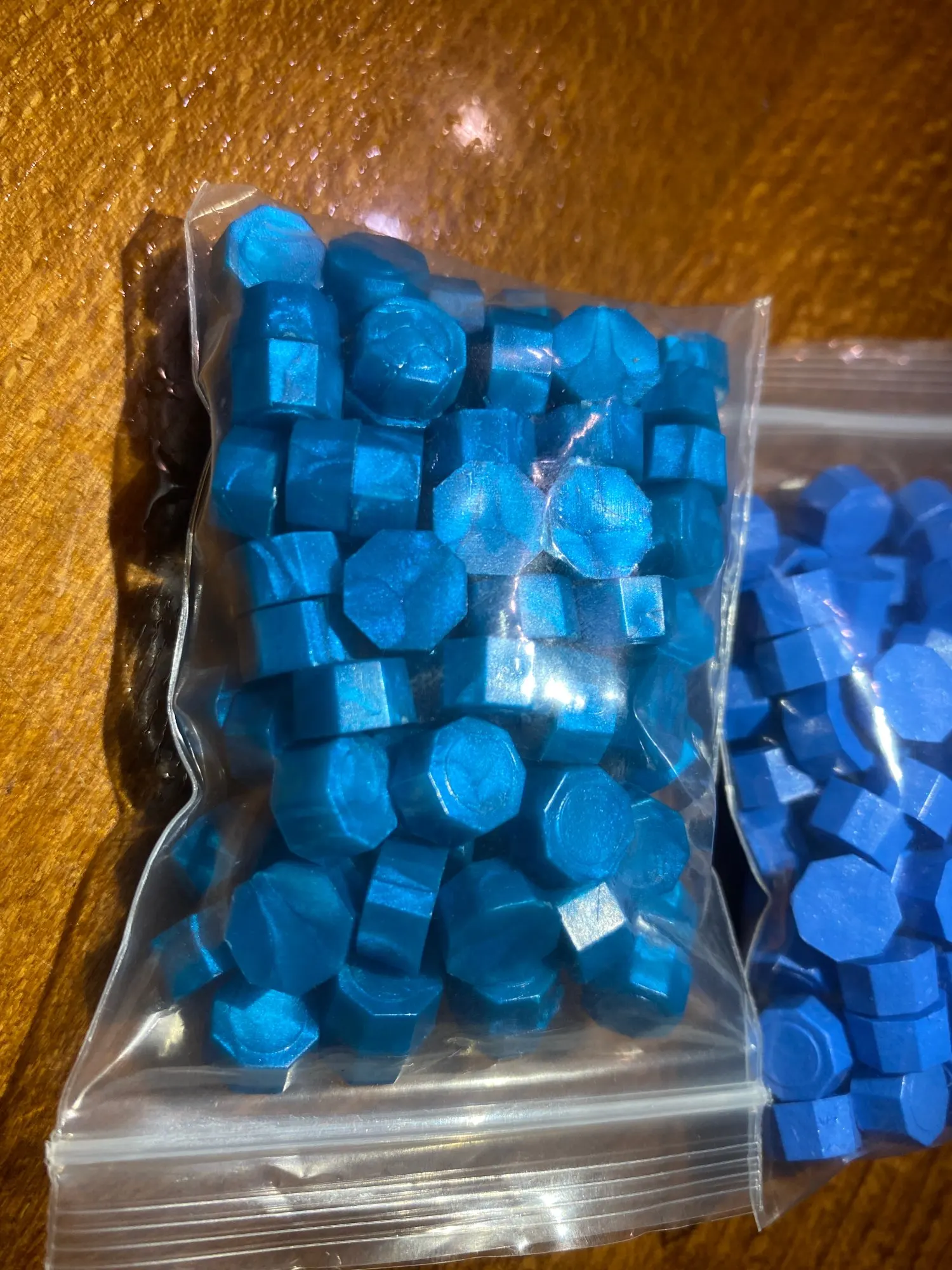 Мне понравилось. Не такой голубой как на картинке, больше синий. С блестками. При нагревании с характерным запахом. Застывает за минуту. Пришло две упаковки с бусинами. На картинке расплавила три бусины, но думаю хватило бы и двух.