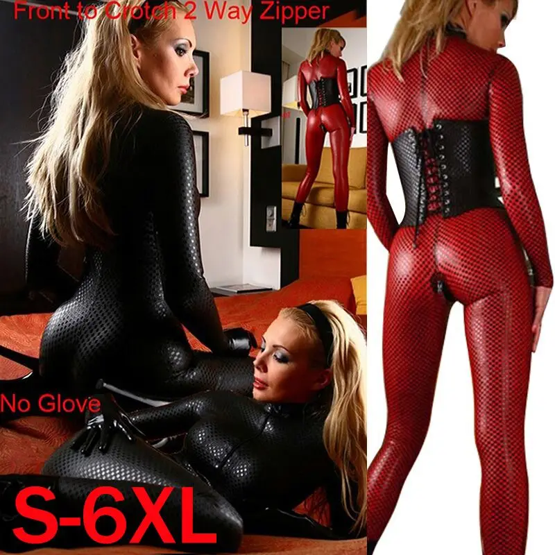 Комбинезон из искусственной кожи, красный, черный комбинезон с 2-сторонней молнией спереди до промежности, Клубная одежда, размера плюс