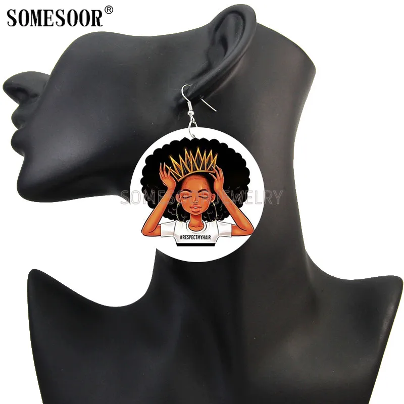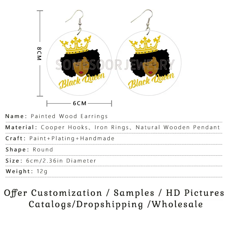Деревянные серьги-подвески SOMESOOR, Черная Королева, уважаемые черные, с меланином, для девочек, волшебный дизайн, Деревянные Подвески с принтом для женщин, подарки