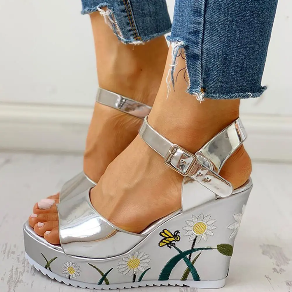 Летние босоножки; Женские Вечерние туфли на танкетке и высоком каблуке с принтом; Женские босоножки на танкетке; Летняя обувь на высоком каблуке; 2020