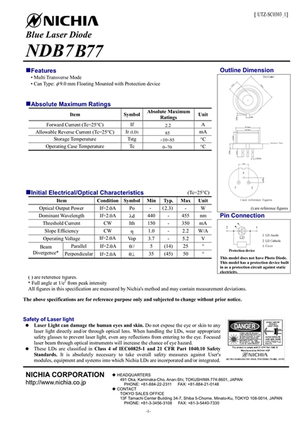 NICHIA NDB7B77 синий 9 мм 2,5 нм Вт лазерный диод LD
