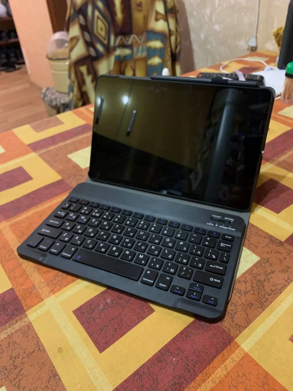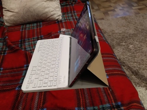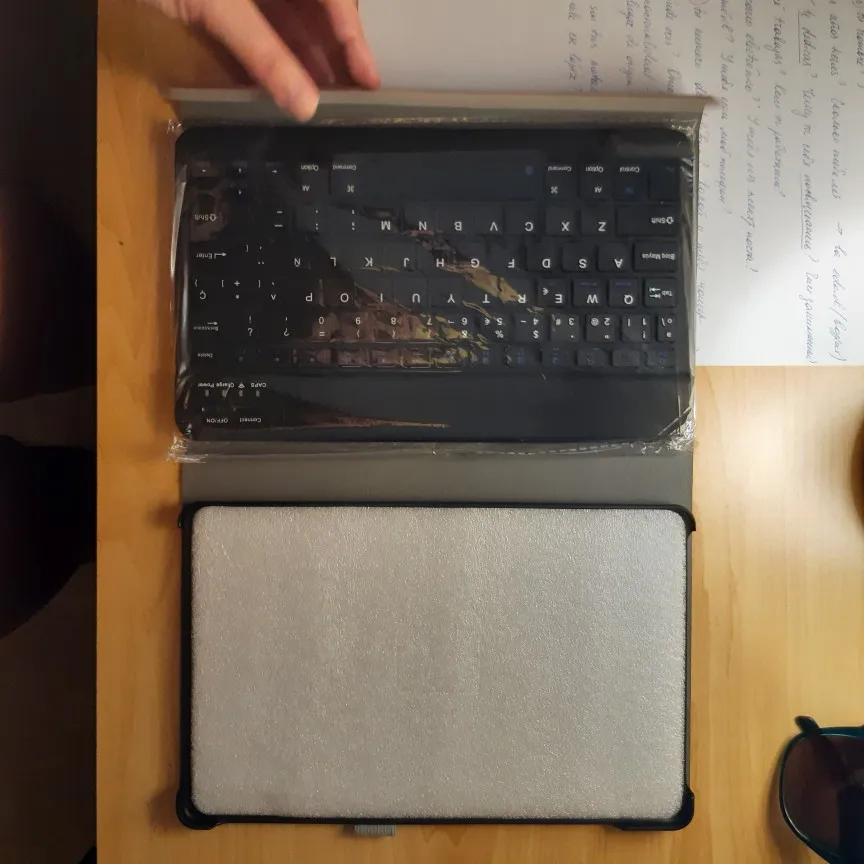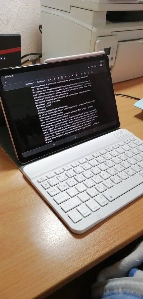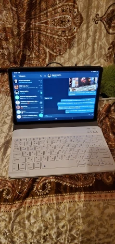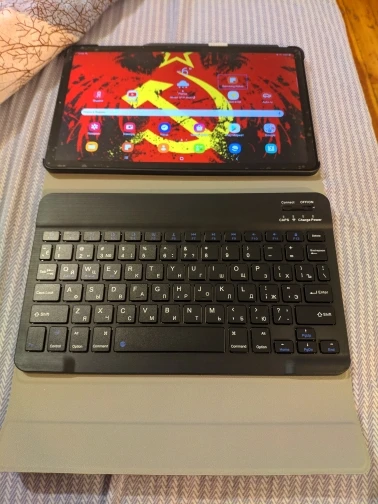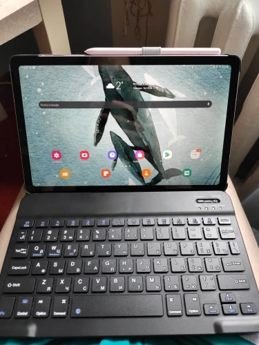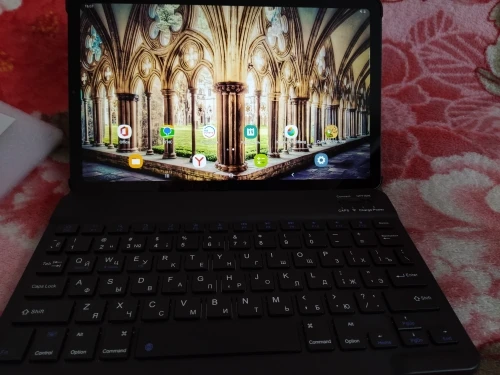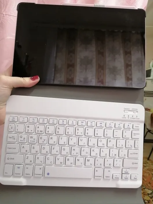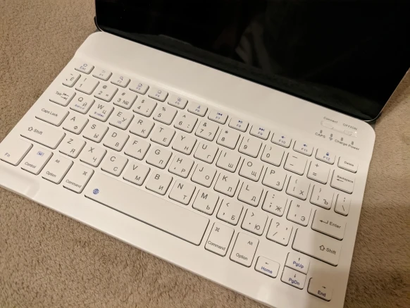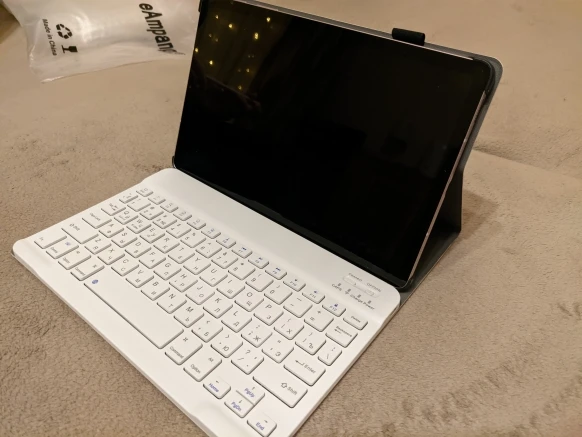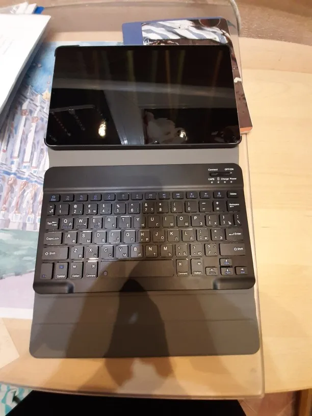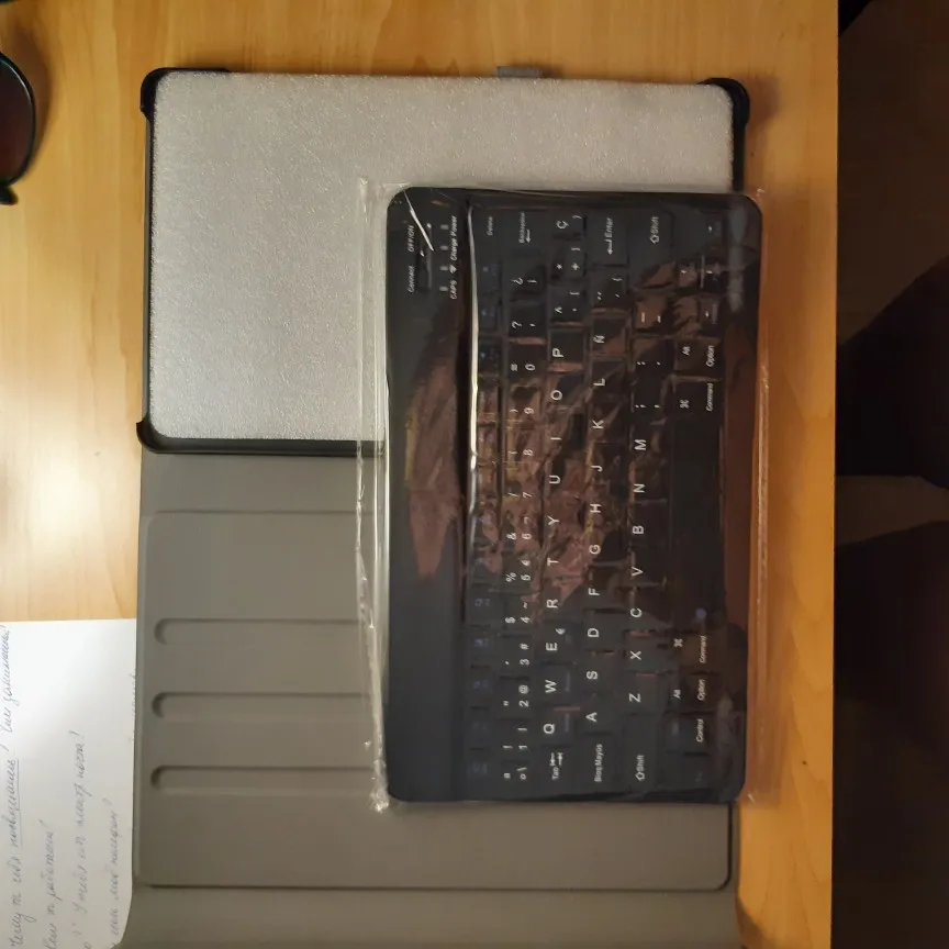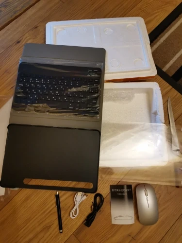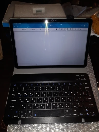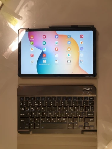 Пришла посылка за 2 недели. Хорошо упакована. В подарок продавец положил ручку и стекло, что очень приятно. Покупали для планшета Самсунг Галакси Таб С6 Лайт 10.4. Клавиатура на магнитах. Подключилась по блютусу быстро. Можно снять клавиатуру и использовать как просто чехол. Муж остался доволен покупкой.