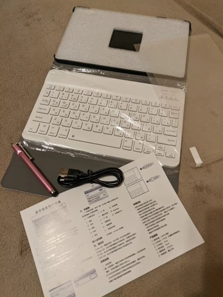 чехол и клава отличные! приятные на ощупь, функциональные. стилус держится. доставлено iml, соответственно, коробка и все остальное в идеале. доставка всего 3 дня. имеется дельная инструкция на английском по подключению клавы, шнур для зарядки. единственное, что чехол не "умный", при открытии планшет не "просыпается", ну так за эту цену да ещё и с клавиатурой и подарками уже не суть важный функционал. продавец положил в подарок стилус, защитную пленку на дисплей. от души рекомендую хорошего продавца и его качественный товар! сама уже приглядываюсь к ещё одному кейсу, уже полегче который, без клавиатуры.