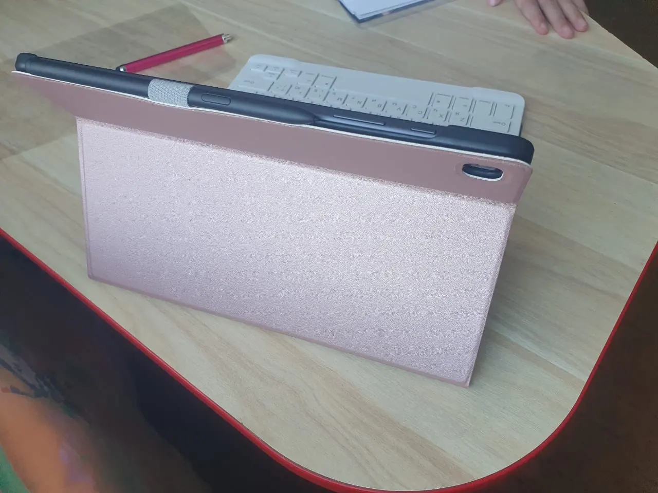 Доставка быстрая. Меньше двух недель. В фирменной коробке, которая не помялась, выглядит очень презентабельно. Всё как у всех: положили еще пленку с инструкцией и стилус. Пленка не понравилась, но как временная мера перед стеклом сойдет. Стилус очень хорошо подошел для телефона, чувствительность в норме, не понимаю, почему другим не нравится (хотя по сравнению со стилусом от самсунга естественно ощутимая разница). Сам чехол приятный на ощупь, пачкается, удобный, но если убрать стилус в отведённое место - не закрывается, слабенький магнит (если стилус примагничивать как на фото-все закрывается). Клавиатура классная, чувствительность снижена (если быстро писать не успевает среагировать), через вай фай только подключение, потом можно отключить и юзать без проблем, пауз в работе нет. Чехол практичный, с обратной строны закрывает камеру, черные вставки удобные, мягкие, закрывают углы планшета и нижнюю сторону. За такую сумму однозначно рекомендую. Спасибо за прекрасную работу)))))) ❤️❤️❤️