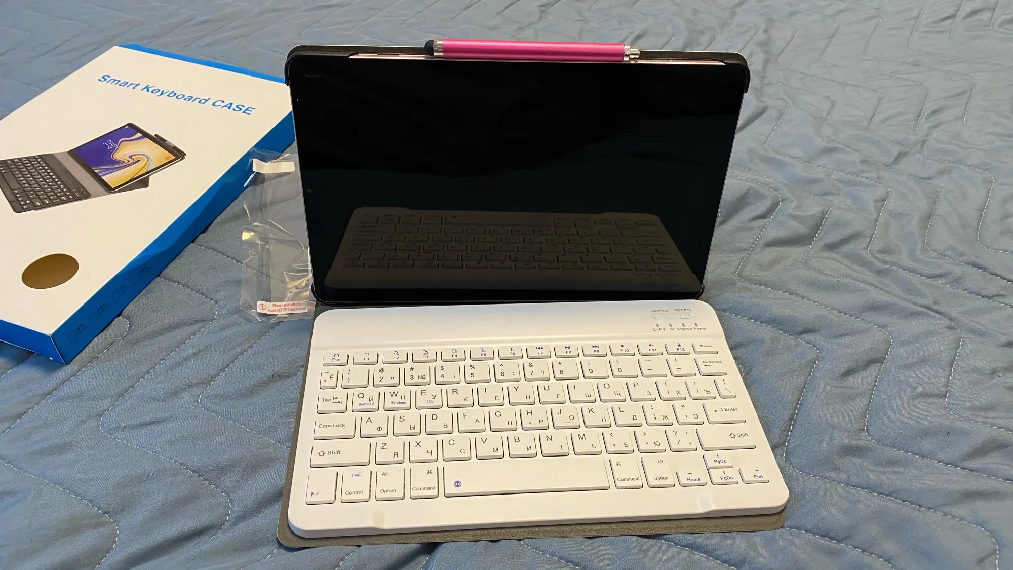 клавиатура подключилась быстро,работает исправно,но надо привыкать к ней. упакованно очень хорошо,чехол подошол как влитой,продавец положил тонкое защитное стекло,за что ему отдельное спасибо вердикт:все отлично,если еще думаете покупать или нет,то однозначно покупать
