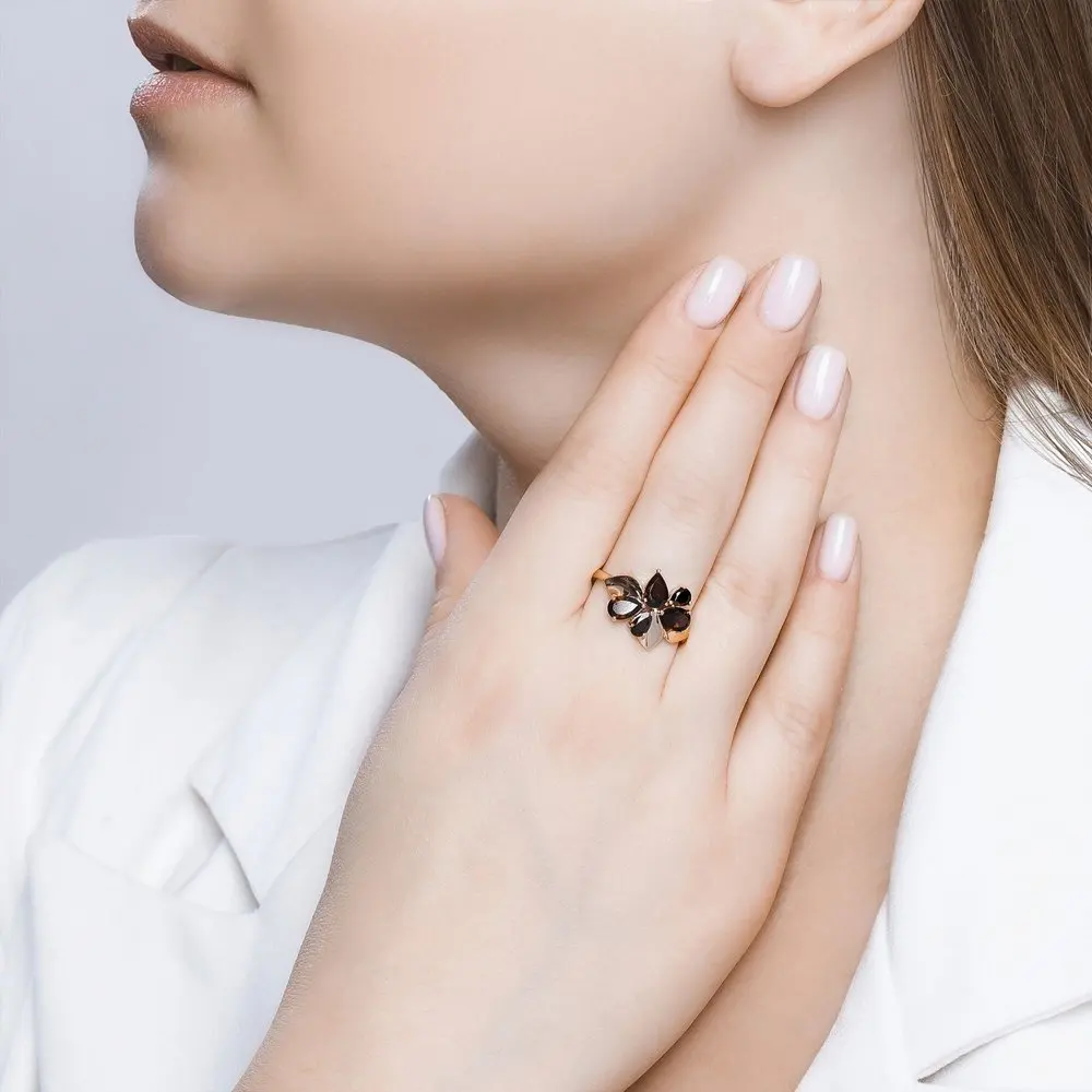 Кольцо SOKOLOV из золота с гранатамиВ каждом модном сезоне благородные оттенки бордо и марсала находятся в списке трендов. Эффектное кольцо из золота станет яркой и запоминающейся деталью повседневных или вечерних образов. Гранатовые вставки, напоминающие лепестки, демонстрируют живую выразительность благодаря классической огранке и крапановой закрепке, которые позволяют любоваться глубиной и переливами камней роскошного винного цвета.