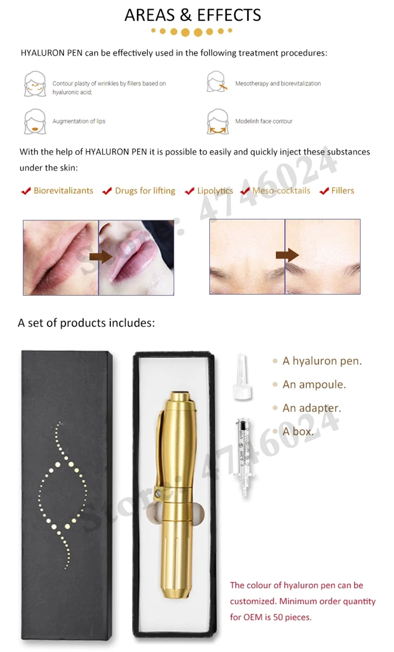 Описание продукта: Тип: гиалуроновой ручка Особенности: удаление кровеносных сосудов, омоложение кожи, темные круги, удаление морщин, потеря веса, увлажняющий крем, отбеливание, увлажняющий крем Материал: 316 нержавеющая сталь (Профессиональная Медицинская нержавеющая сталь) Объем впрыска: 0,3 мл/0,5 мл Режим работы: распыление высокого давления/мульти-съемка Глубина измерения: 6-8 мм Максимальное давление: 7,4 Pa Операционный замер: 0.010.12 мл Принцип работы: Пружина и поршень, которые позволяют под давлением быстро и равномерно вводить препараты под кожу через отверстие диаметром 0,1 мм, что в два раза меньше толщины иглы для инъекций! С помощью энергии механического действия пружина и специальный поршень в аппарате позволяют под давлением быстро, но аккуратно проталкивать поток лекарств через Микроскопическое отверстие в подкожной ткани. Препараты усваиваются гораздо лучше и быстрее, чем с введением иглы, что было подтверждено в серии исследований и тестов, проводящихся в разных странах мира. Идеальное решение для тех, кто подвержен рубцам и подкожным сгусткам. Преимущества ручки Hyaluron: * Не вызывает болезненных ощущений впрыска топлива * Инъекция без иглы устраняет риск инфекции от иглы * Не оставляет шрамов и проколов на ткани кожи с помощью иглы * Лучшее и быстрое поглощение лекарств * Строго Подкожная инъекция-устраняет риск проникновения препарата в мышцу * Быстро, легко и безопасно * Раздельное и экономичное дозирование препарата
