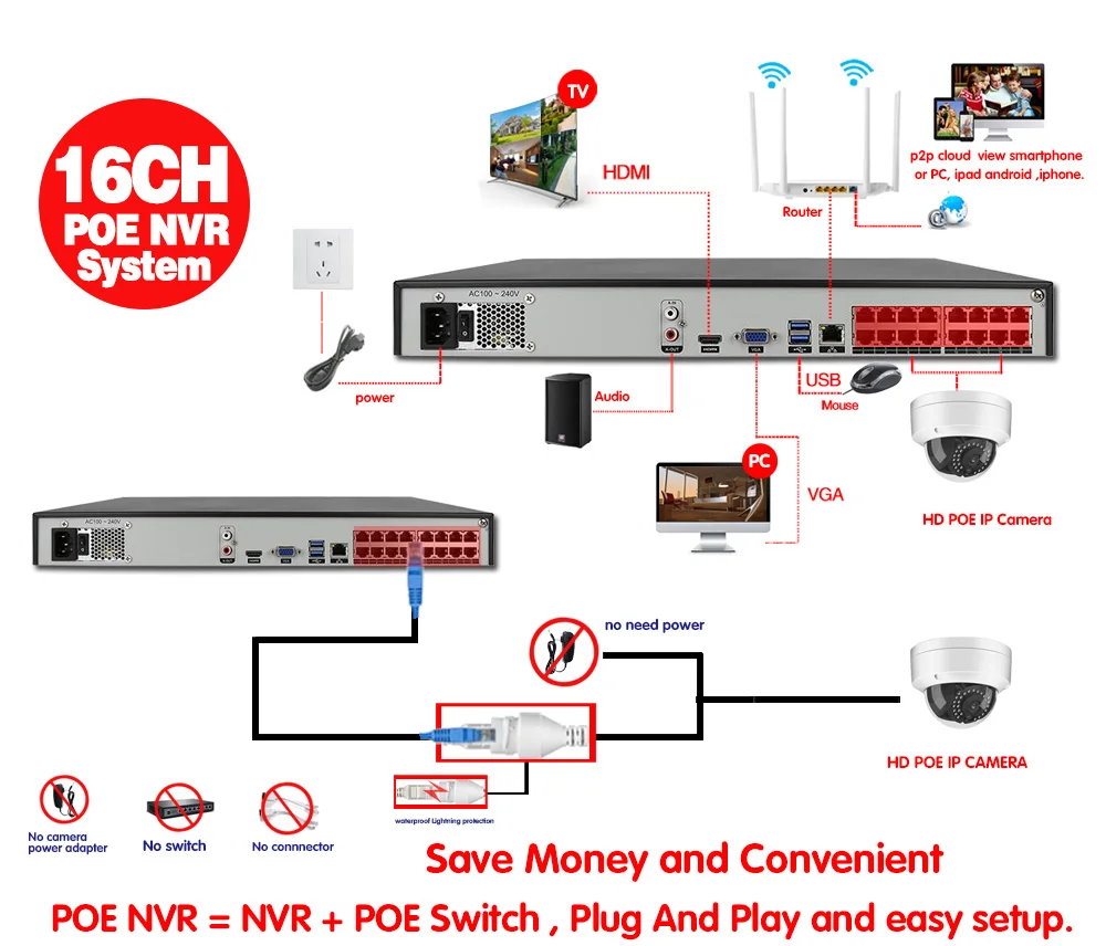 Нет дополнительных кабелей питания или адаптеров, просто подключив ip-камеру к NVR с помощью одного кабеля, вы можете легко завершить установку без знания о компьютере или сети и начать наслаждаться супер простым мониторингом среди вашего смартфона, планшета или ПК.