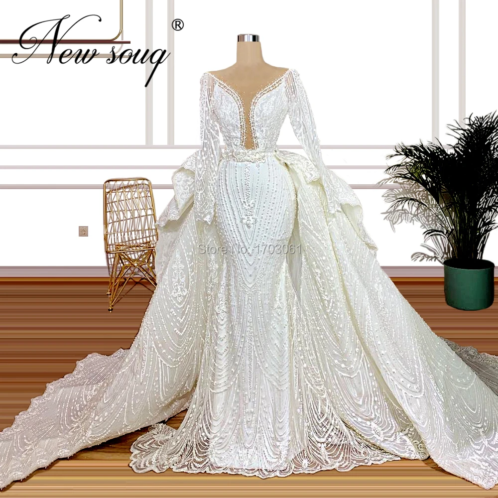 Роскошное блестящее платье-Русалка с бисером, модель 2020 года, арабское свадебное платье, кафтаны с глубоким V-образным вырезом и длинным шлейфом, платье невесты