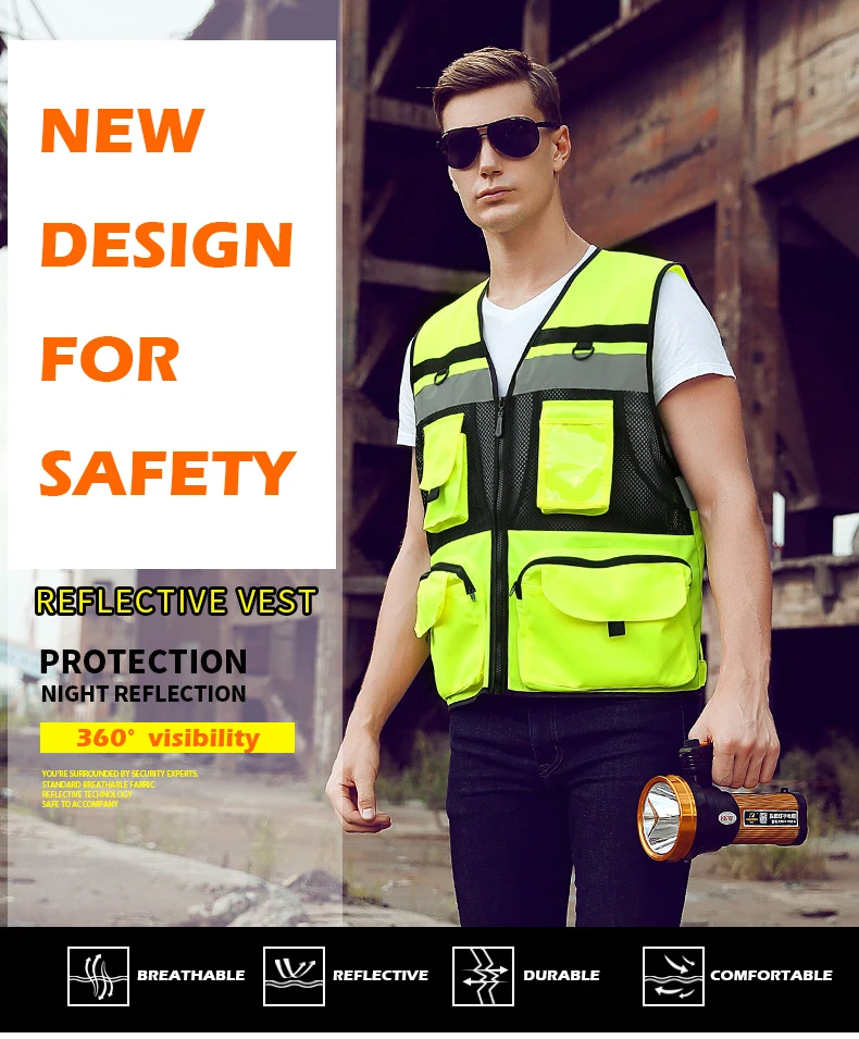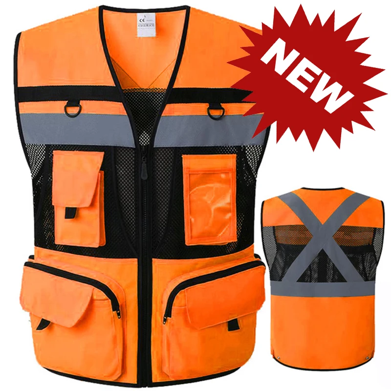 Светоотражающий жилет, летняя жилетка из флуоресцентной оранжевой сетчатой ткани на молнии с большими карманами, 9 карманов, ANSI