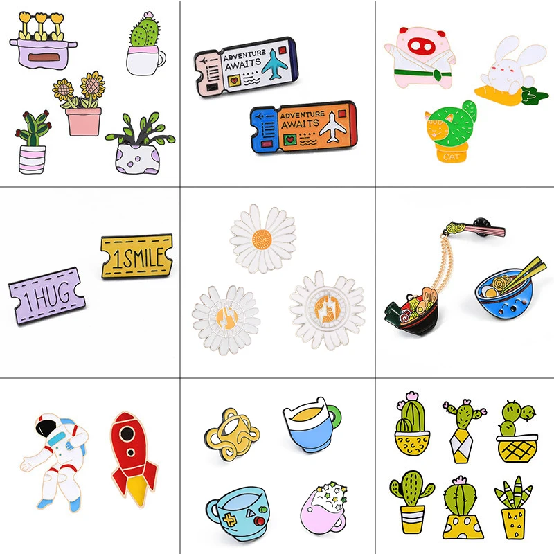 2 6 шт.компл. мультяшная эмалированная брошь в виде кактуса, цветка, поезда, билета, астронавта, чашки, значок, джинсовое пальто, рюкзака, лацканов, значки, ювелирные изделия