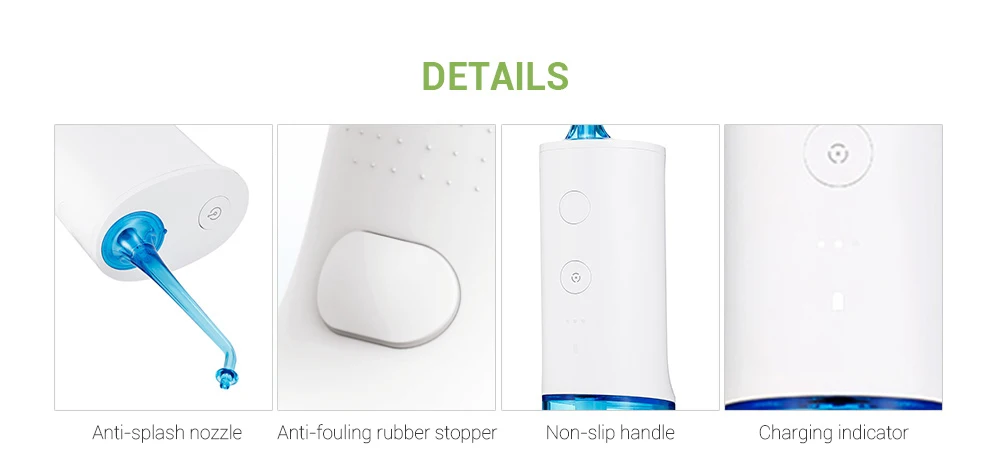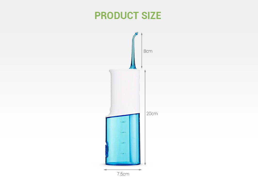 Название продукта: портативный зуб для суши Модель продукта: W3 Посылка включает в себя: корпус/насадка/Инструкция/usb-кабель для зарядки/Водонепроницаемая Резиновая вилка Происхождение: Китай Цвет корпуса: белый, синий Емкость аккумулятора: 2200 мАч Выносливость: 30 дней Время зарядки: около 4-6 часов Объем резервуара для воды: 230 мл