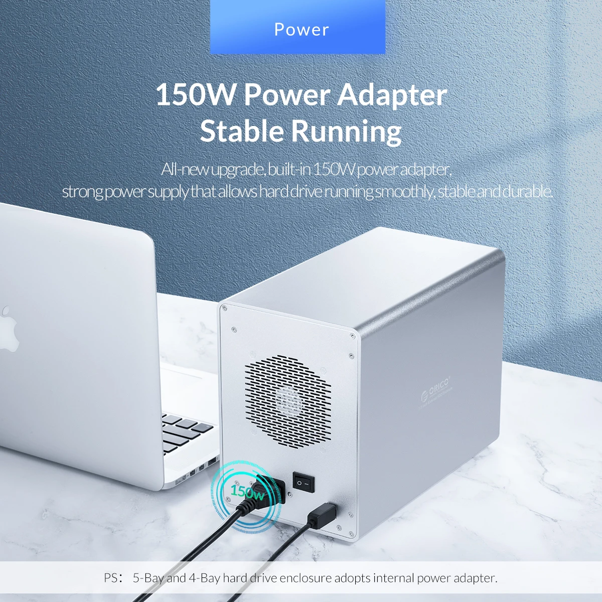 3. 【 Двухъядерный чип и источник питания 150 Вт 】: корпус жесткого диска встроенный двухъядерный чип SATA3.0, обеспечивает безопасность и стабильность хранения и передачи данных, Запираемые отсеки для дисков, защитите жесткий диск с осторожностью и с мощным адаптером питания мощностью 150 Вт для обеспечения стабильного питания для оборудования