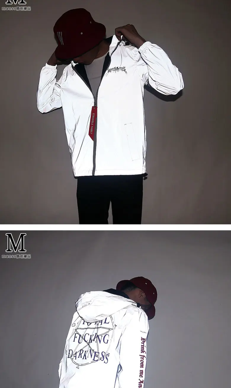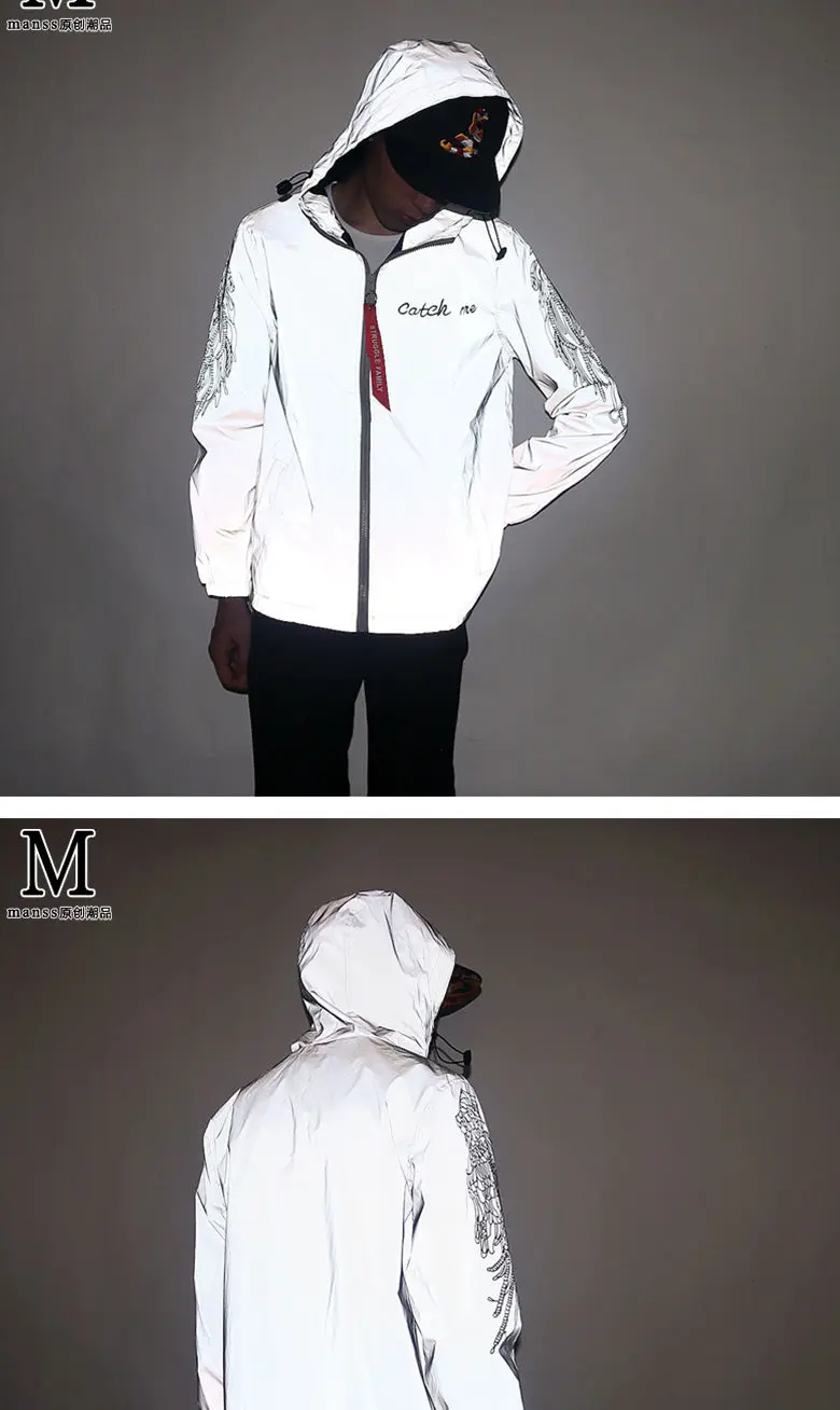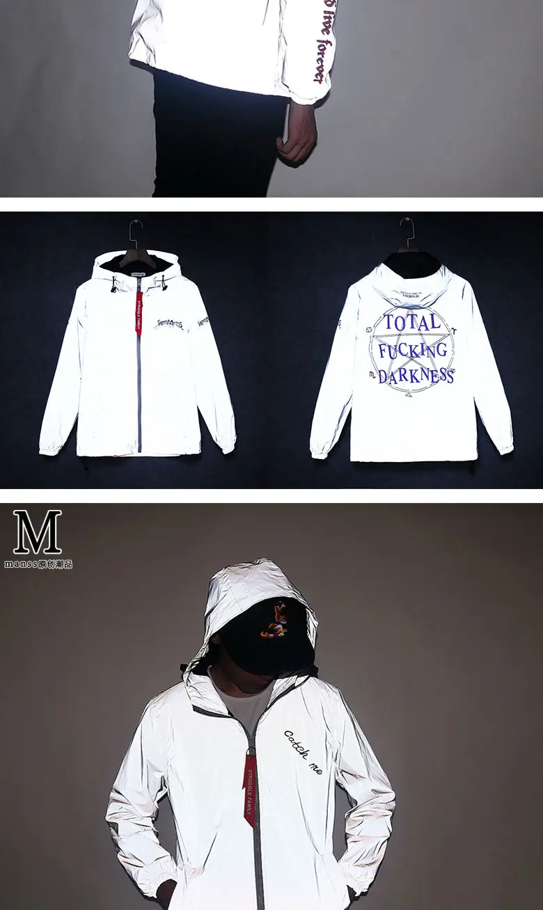 Новая полностью Светоотражающая куртка для мужчин и женщин, ветровка в стиле Харадзюку, уличная одежда в стиле хип-хоп с капюшоном, блестящие пальто на молнии, куртка
