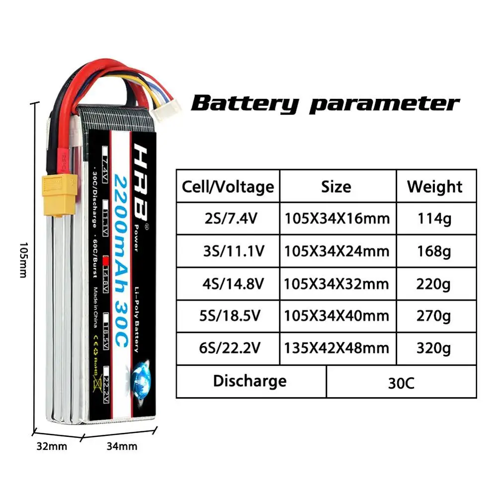 Обратите внимание:Разъем по умолчанию-штепсельная вилка XT60, если вам нужны другие разъемы, пожалуйста, оставьте мне сообщение, спасибо! 7,4 В 2200 мАч 50CВольт: 7,4 ВImensions (ДхШхВ): 88 мм x 34 мм x 18 мм (± 0-3 мм)Вес: 110 ± 2 г 11,1 В 2200 мАч 30CВольт: 11,1Размеры (ДхШхВ): 106 мм x 34 мм x 24 мм (± 0-3 мм)Вес: 170 ± 2 г 14,8 в 2200 мАч 30CВольт: 14,8Размеры (ДхШхВ): 106 мм x 34 мм x 32 мм (± 0-3 мм)Вес: 222 ± 2 г 18,5 V 2200mah 30CВольт: 18,5Размеры (ДхШхВ): 106 мм x 34 мм x 40 мм (± 0-3 мм)Вес: 274 ± 2 г 22,2 в 2200 мАч 30CВольт: 22,2Размеры (ДхШхВ): 106 мм x 34 мм x 48 мм (± 0-3 мм)Вес: 320 ± 2 г Полезные знания:Самым простым способом для того, чтобы определить оставшаяся емкость батареи состоит в том, чтобы измерять напряжение (например 4,2 V батареи):4,20 в ---- 100%3,95 в ---- 75%3,85 В ---- 50%3,73 в ---- 25%3,50 в ---- 5%2,75 в ---- 0%Никогда не, чтобы напряжение ниже 3,6 V во время использования, в результате чего сопряжение или ваша батарея будет уничтожена.
