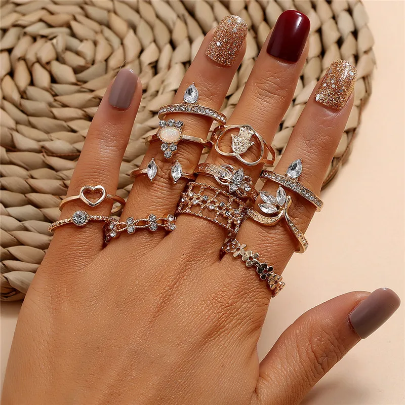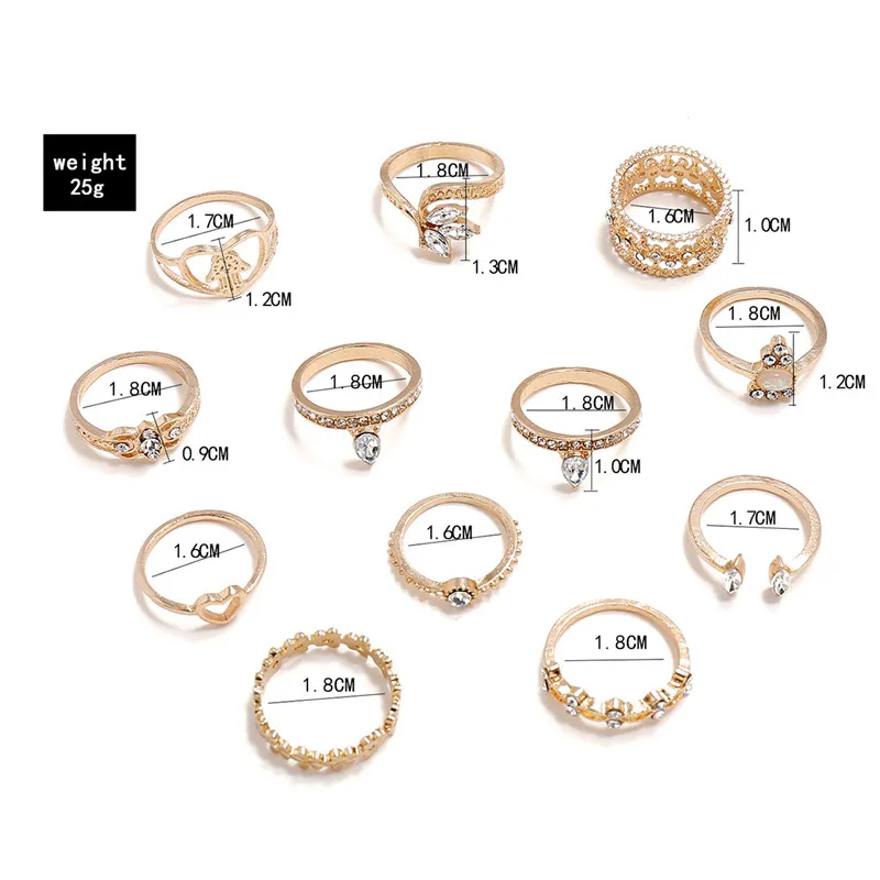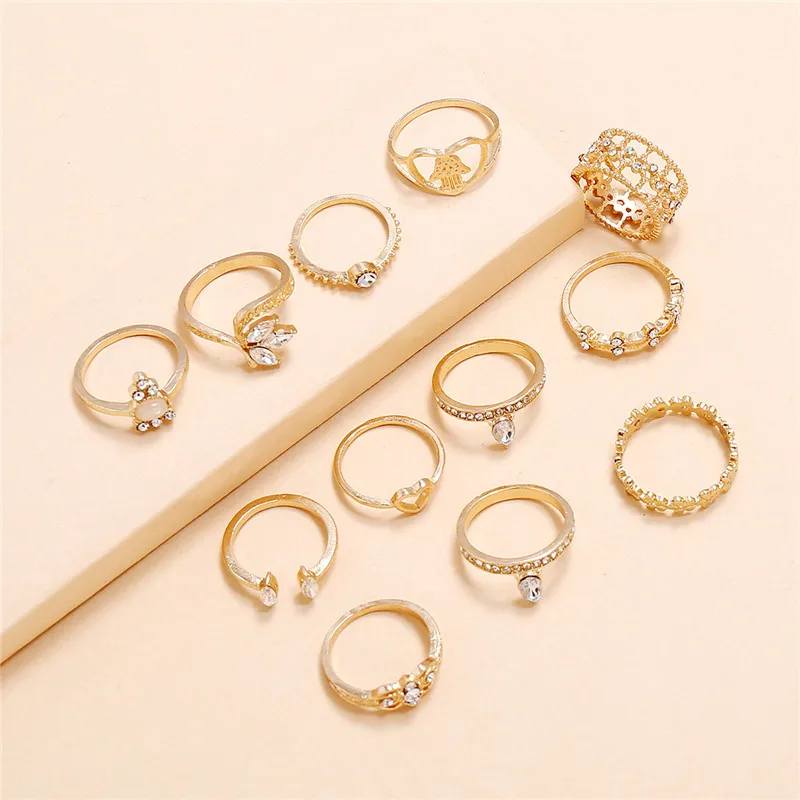 Letfi 12 шт.компл., богемное кольцо с золотым кристаллом, геометрическим листом, сердцем и цветком, набор женских очаровательных колец, вечерние ювелирные изделия для свадьбы